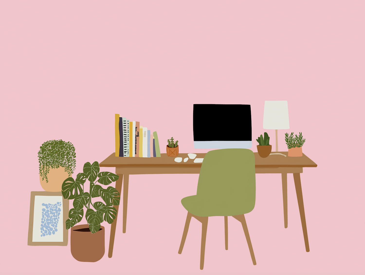 Minimalist workspace illustration with a wooden desk, green chair, computer, books, and potted plants against a pink background.
