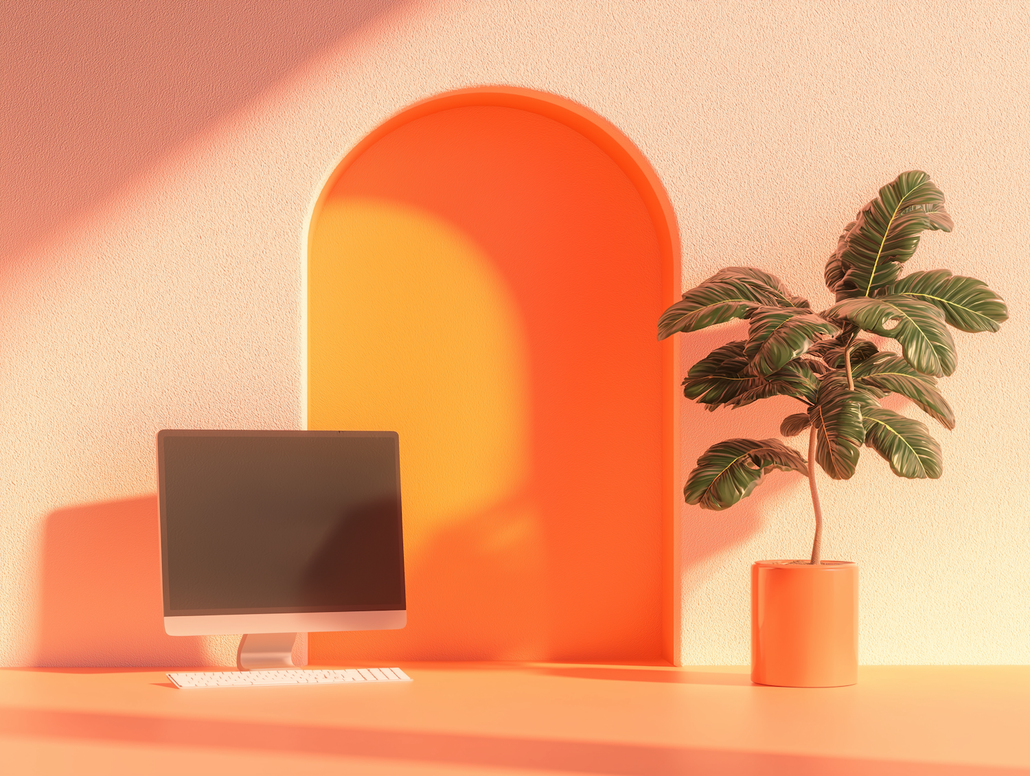 Minimalist workspace with a sleek computer, orange desk, and a potted plant against a warm arched alcove. Perfect for modern design lovers.