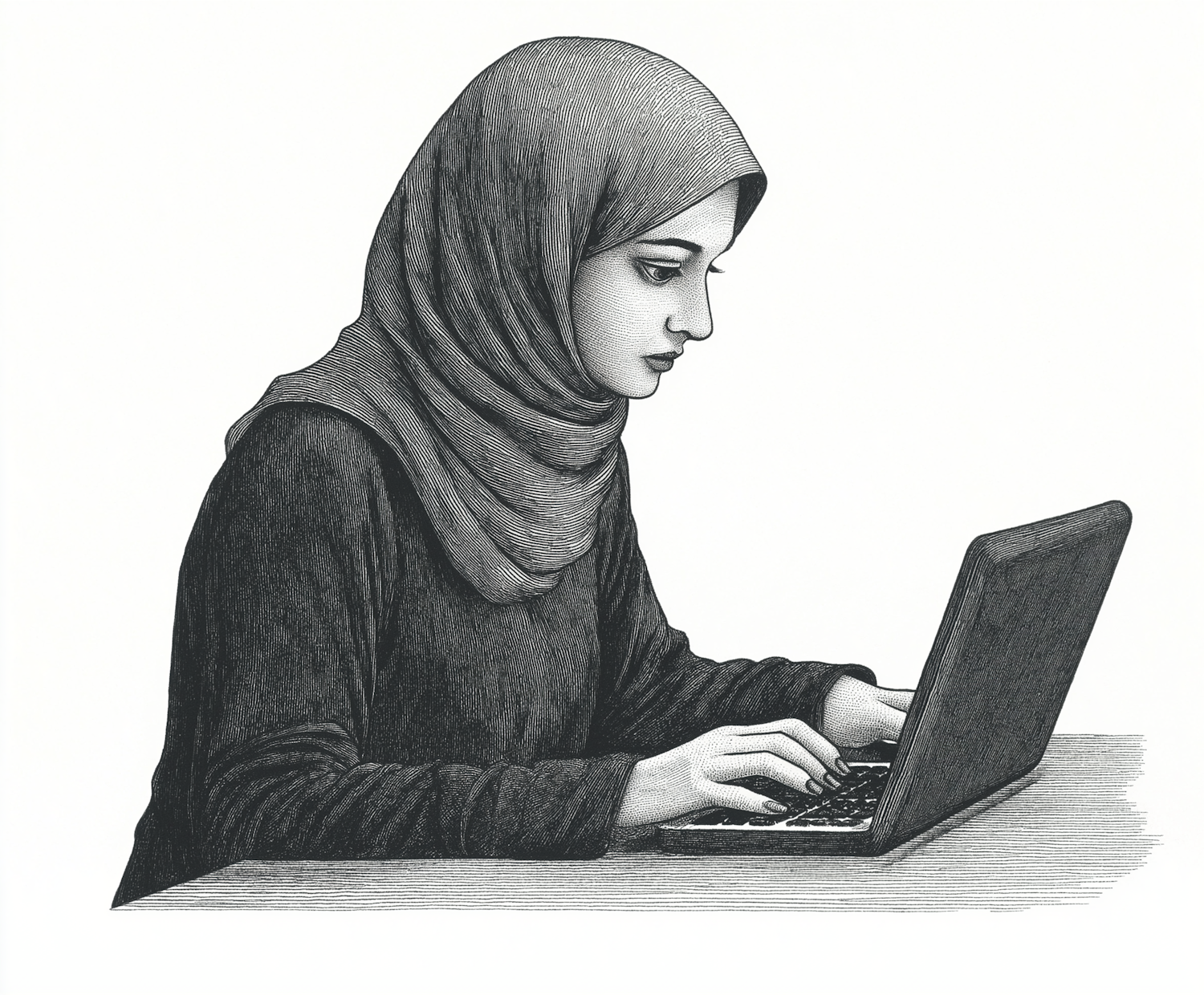 Detailed black and white illustration of a woman in a hijab typing on a laptop, showcasing focus and concentration.