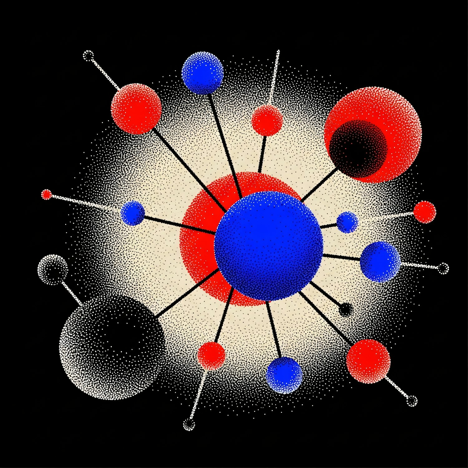 Abstract molecular structure illustration with vibrant red and blue spheres connected by lines on a black background.