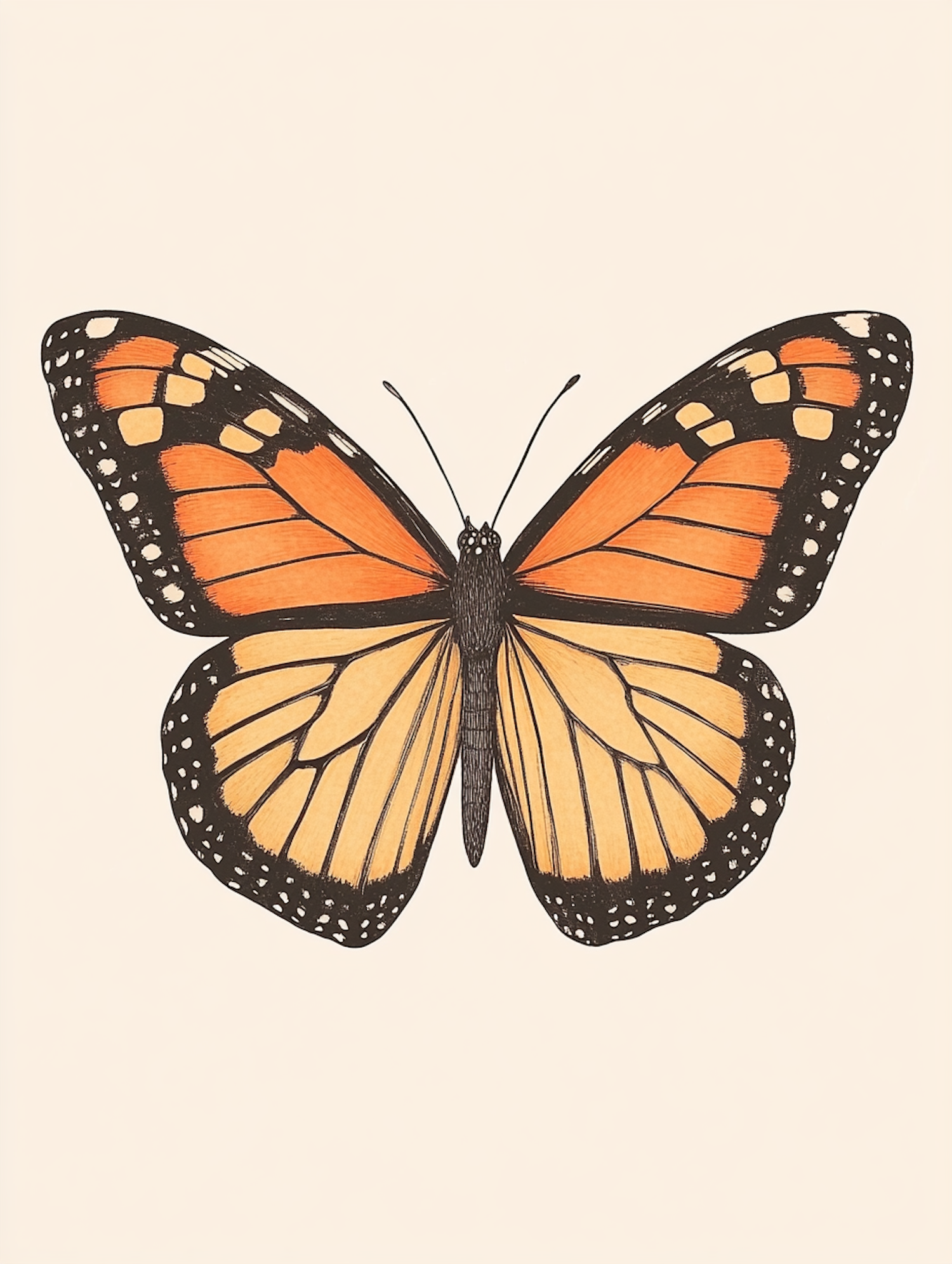 Detailed illustration of a monarch butterfly with vibrant orange and black wings on a light beige background.