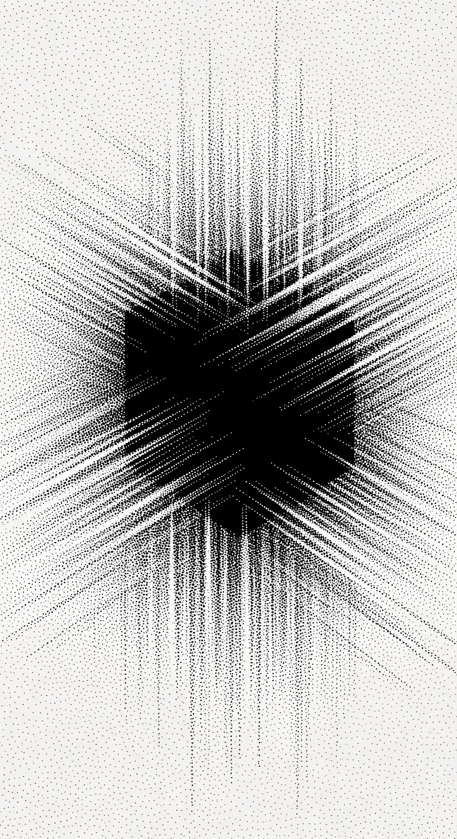 Abstract black and white illustration with a central shape, radiating lines, and dotted texture, creating a dynamic and textured composition.