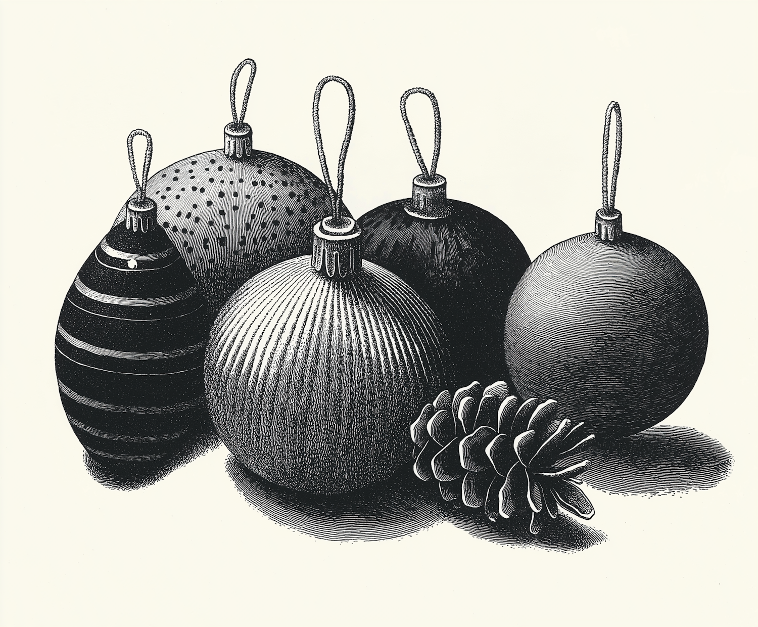 Elegant black and white illustration of Christmas ornaments and a pine cone, showcasing intricate patterns and textures.