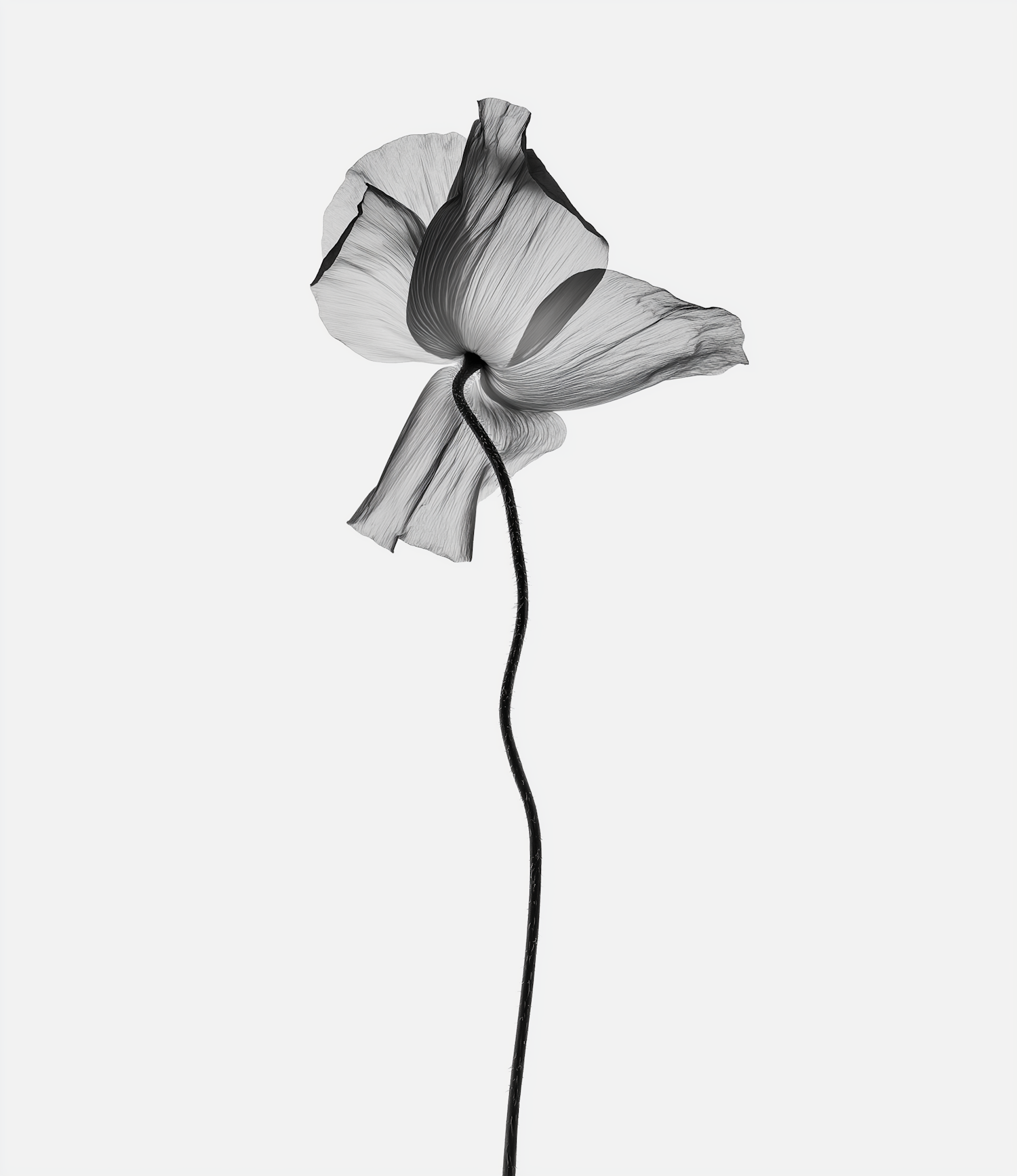 Minimalist black-and-white artwork of a single flower with flowing petals and a curved stem on a white background.