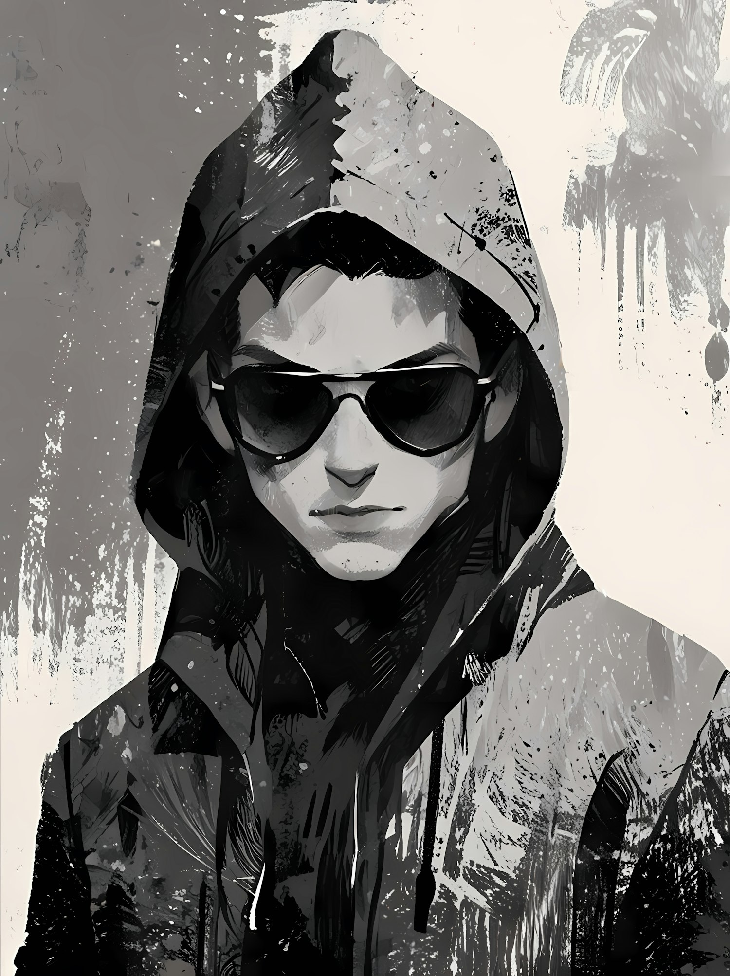 Stylish monochromatic portrait of a person in sunglasses and a hoodie with abstract textured design elements.