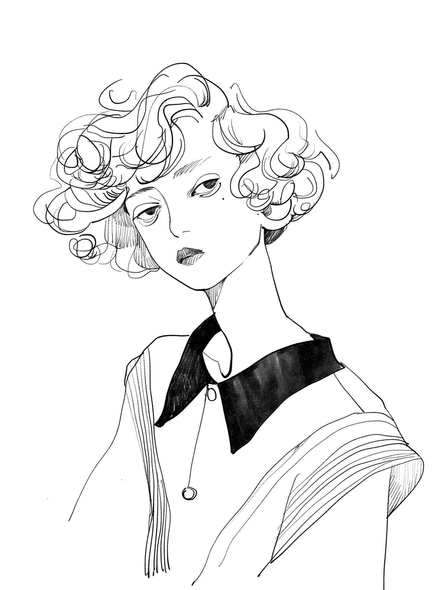 Elegant black and white illustration of a person with curly hair and a contemplative expression, wearing a collared shirt.