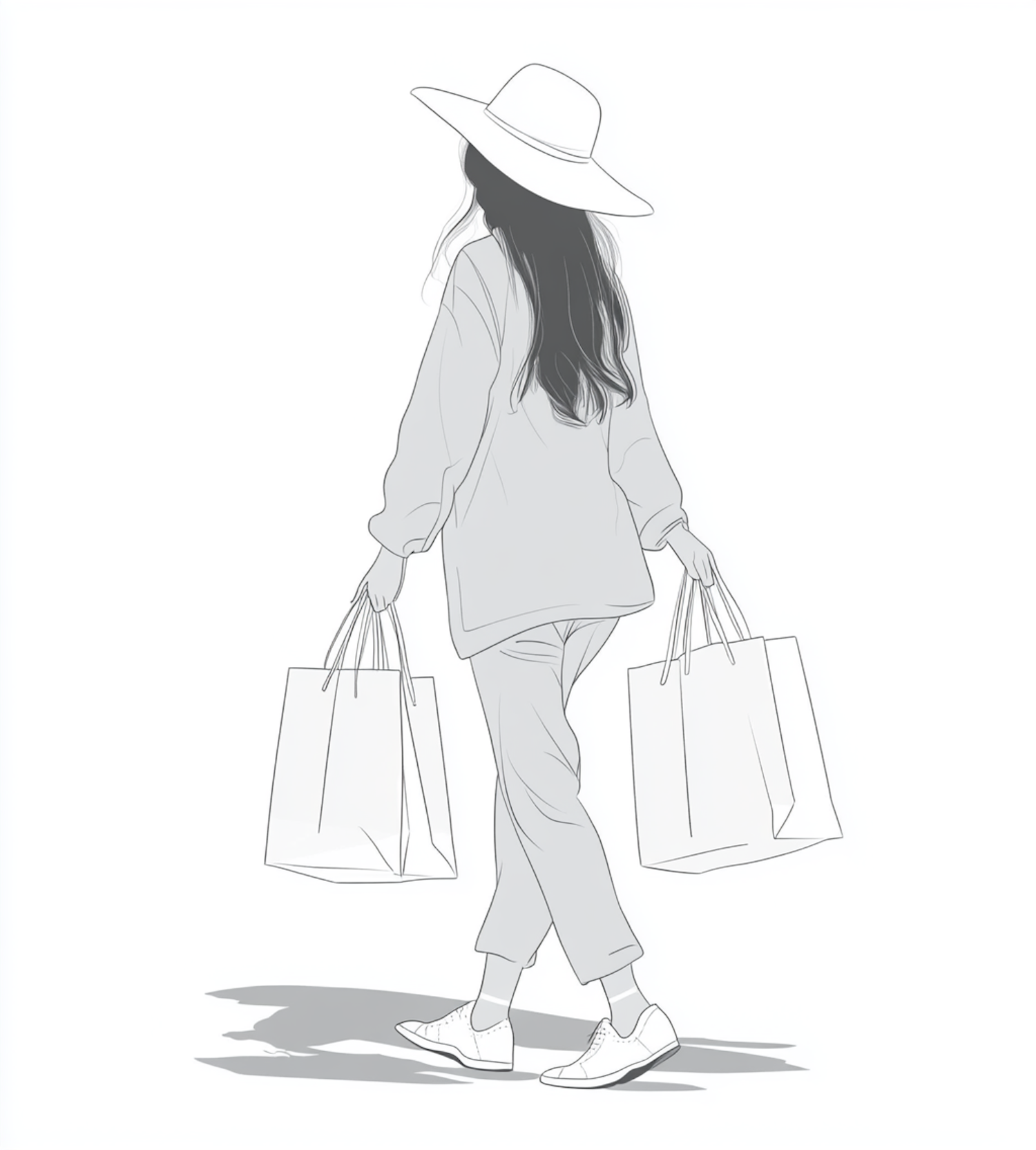 Elegant illustration of a woman with shopping bags, wearing a wide-brimmed hat and casual attire, in a minimalist style.