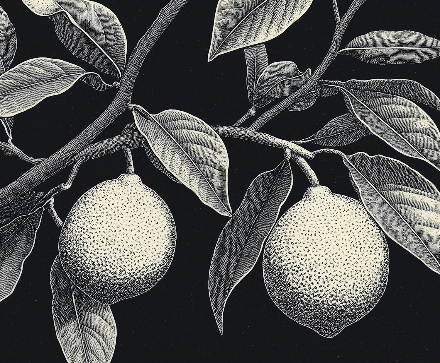 Intricate black and white illustration of lemons on a branch with detailed leaves against a dark background.