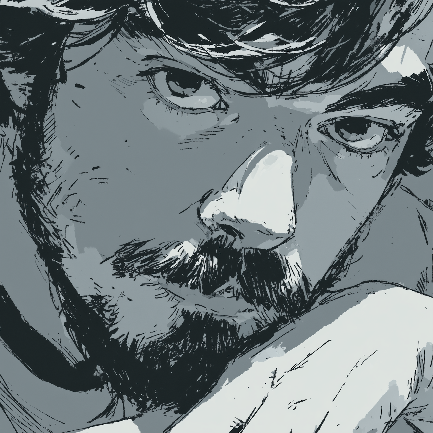 Monochromatic sketch-style illustration of a bearded man with intense eyes, showcasing detailed facial features and textured shading.