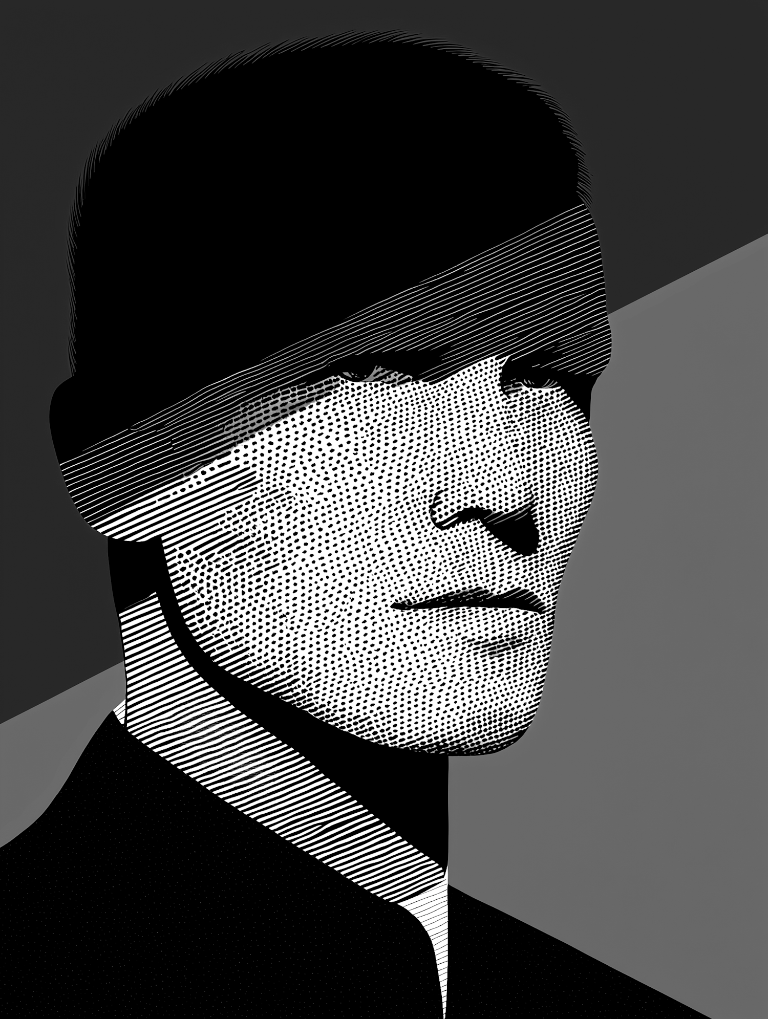 Stylized black and white illustration of a man's face with halftone texture and geometric background.