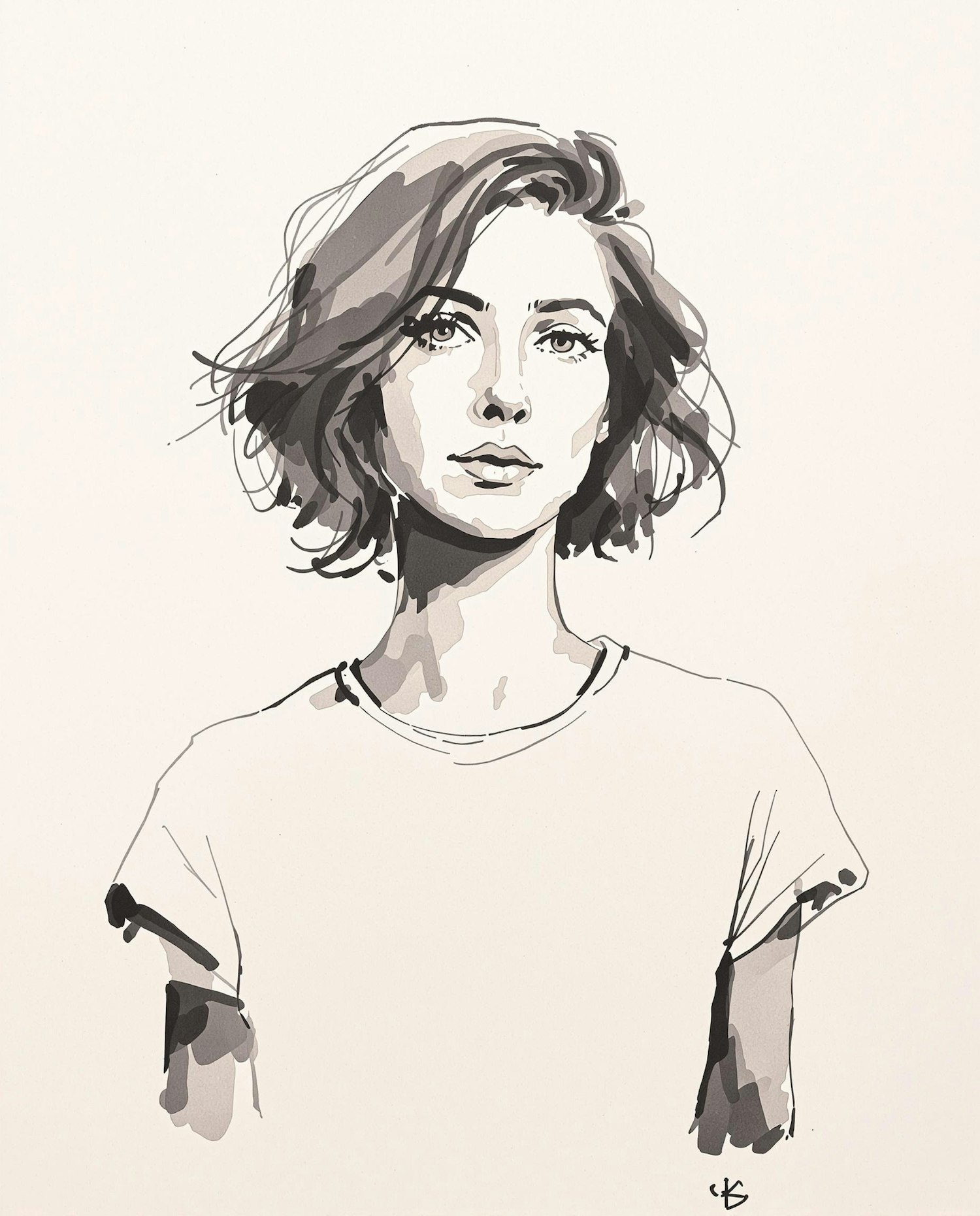 Ink and wash-style monochrome portrait of a woman with short wavy hair, wearing a simple white t-shirt. Slight asymmetry and organic brushwork visible. Only the upper torso is visible. Subtle shadows. No color except diluted black ink. Artistic, expressive, minimal