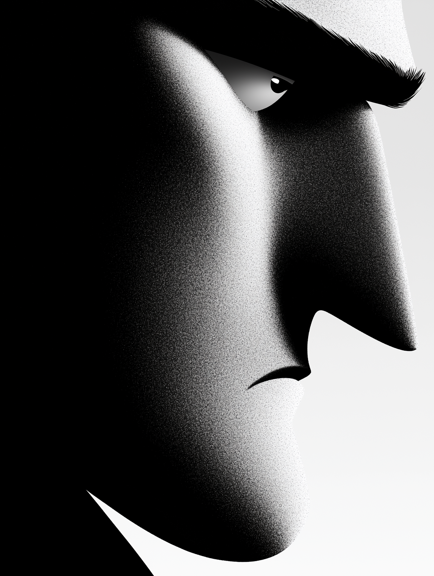 Stylized grayscale illustration of a man's stern profile with intense expression and sharp features.