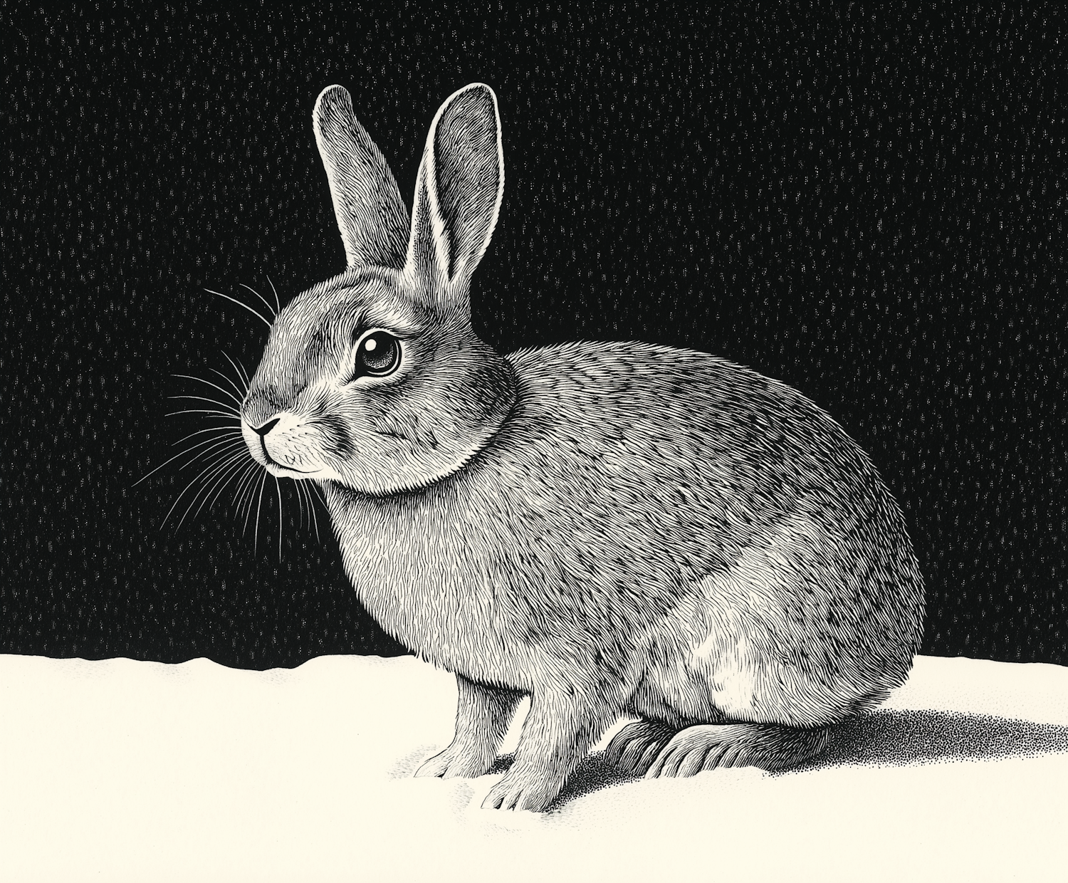 Intricate black and white illustration of a rabbit on snow, with detailed fur texture and expressive eyes against a dark background.