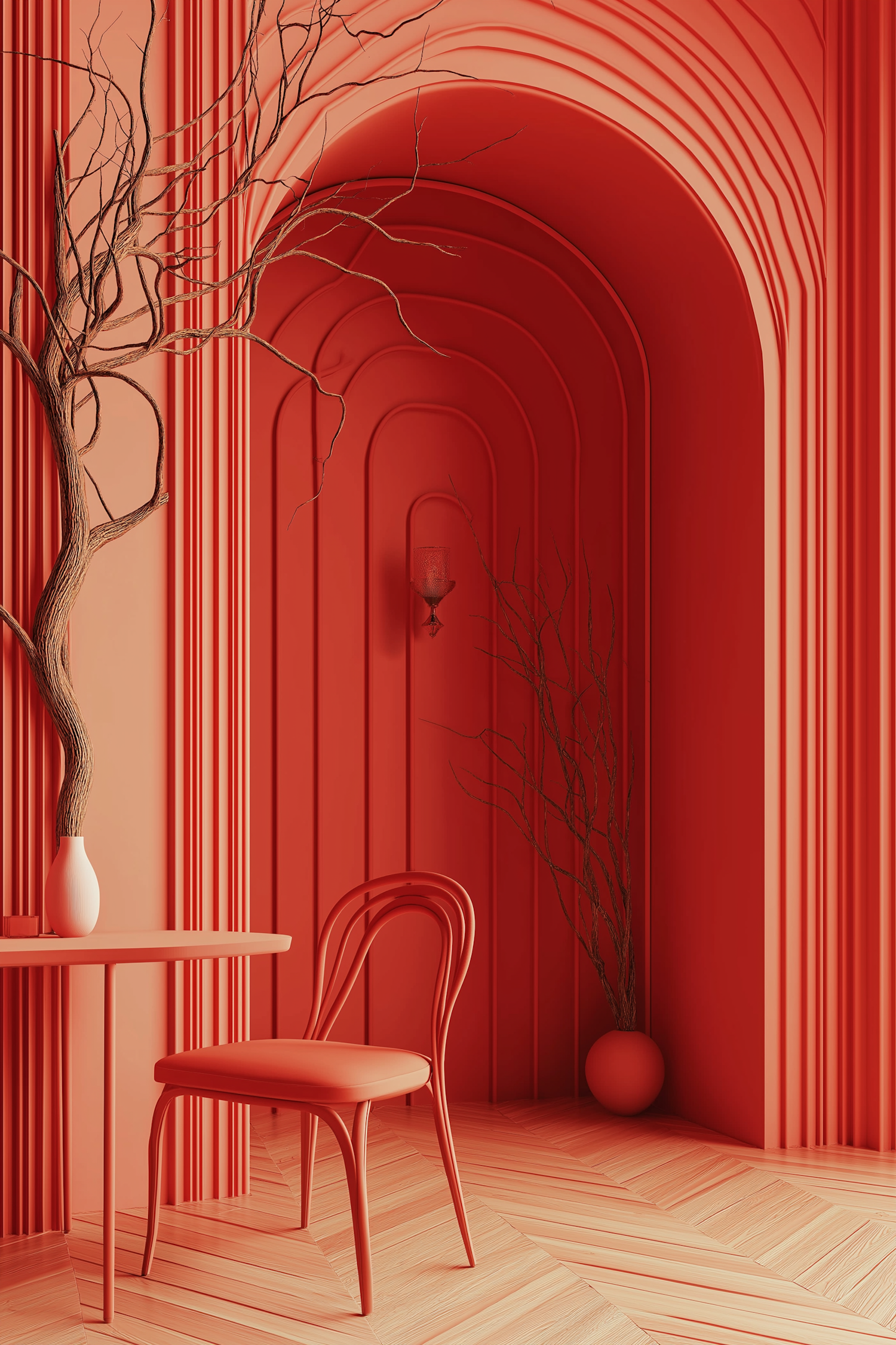 Bold red interior with arched alcoves, a red chair and table, and a bare branch in a vase. Light wood herringbone floor adds contrast.