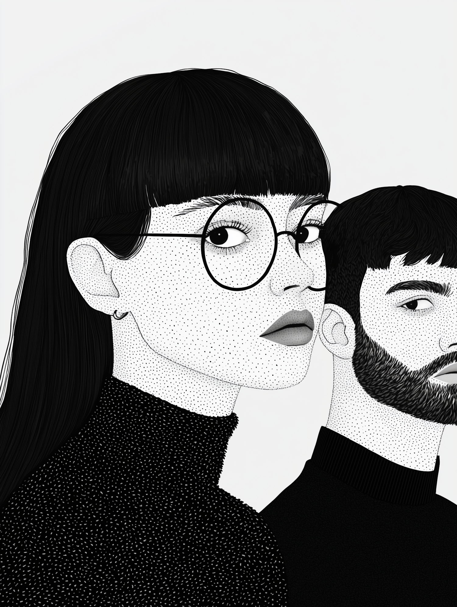 Stylish black and white illustration of a woman with glasses and a man with a beard, both in turtlenecks, using stippling technique.