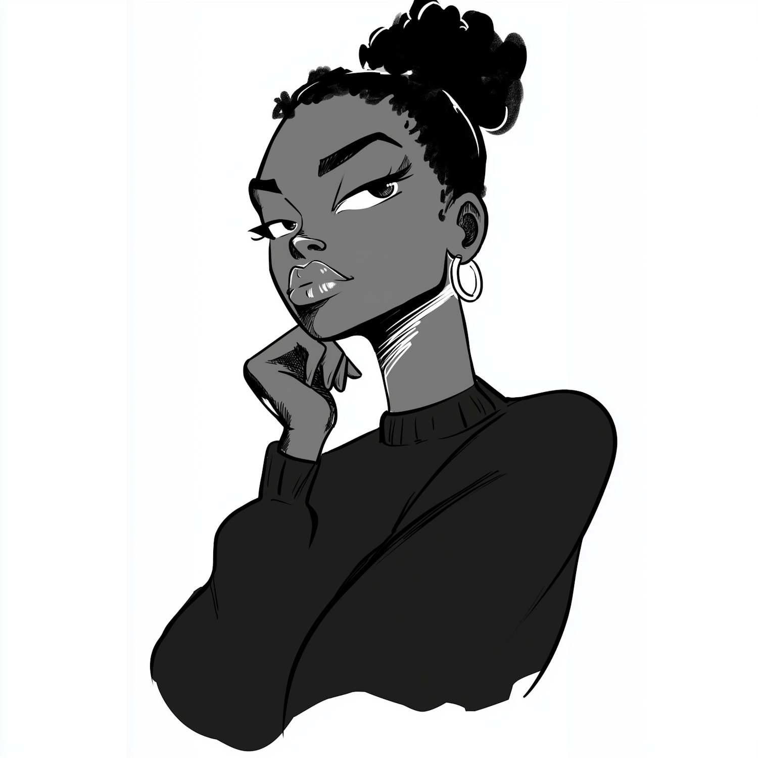 Stylized illustration of a confident woman with a high bun and hoop earrings, resting her chin on her hand. Monochrome color scheme.
