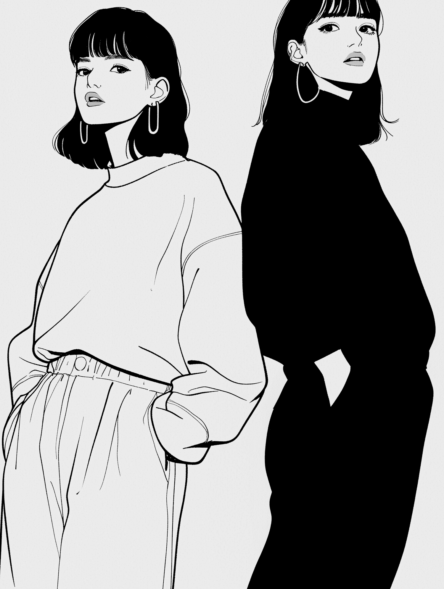 Stylish black and white illustration of two women with hoop earrings, showcasing bold fashion and confident expressions.