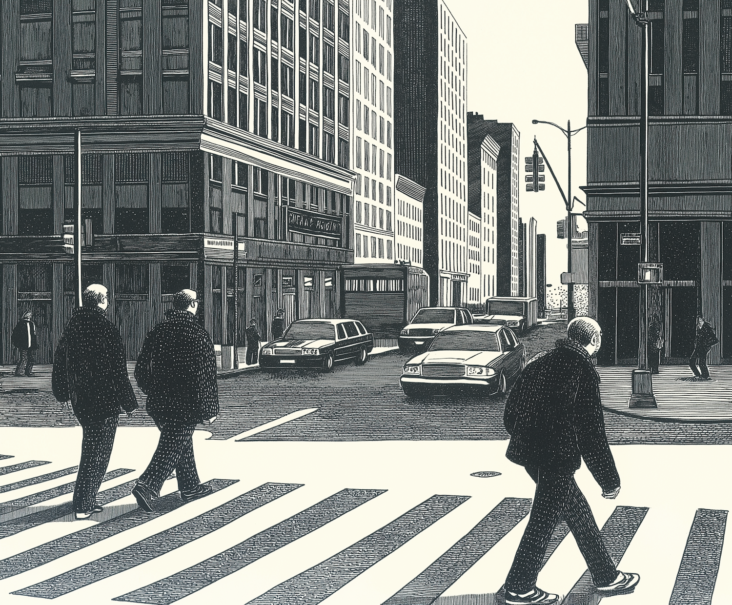 Black and white city street illustration with three men crossing, tall buildings, and cars. Captures urban life and architecture.