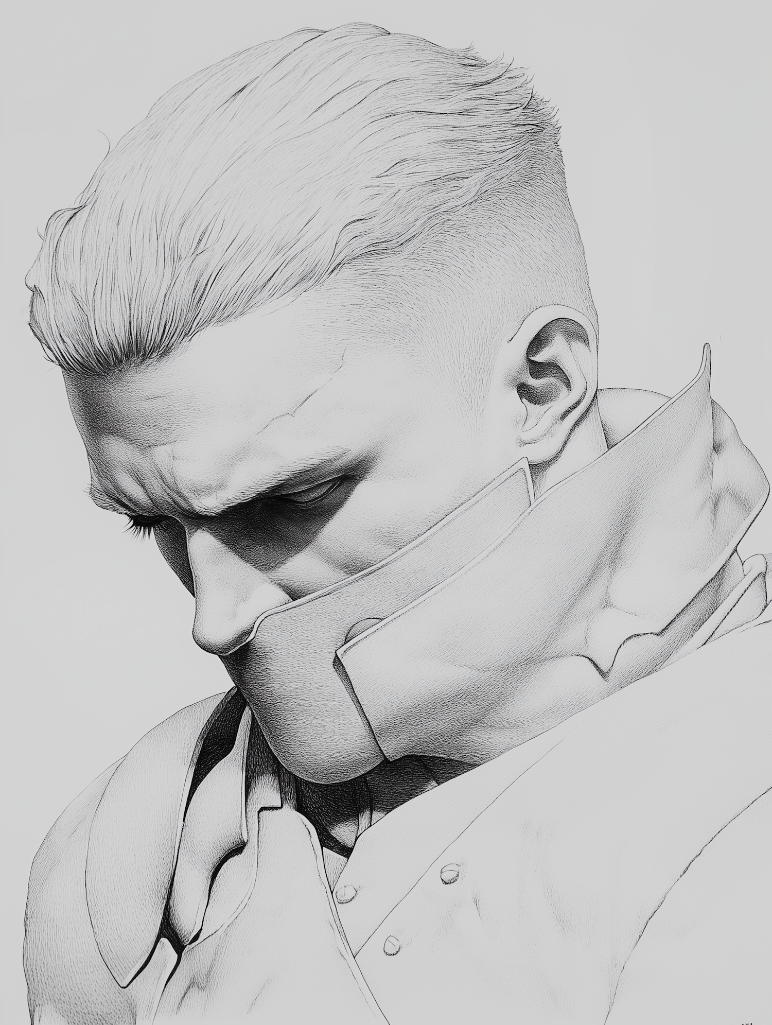 Monochrome illustration of a man with a high-collared coat, intense expression, and detailed shading, creating a mysterious atmosphere.