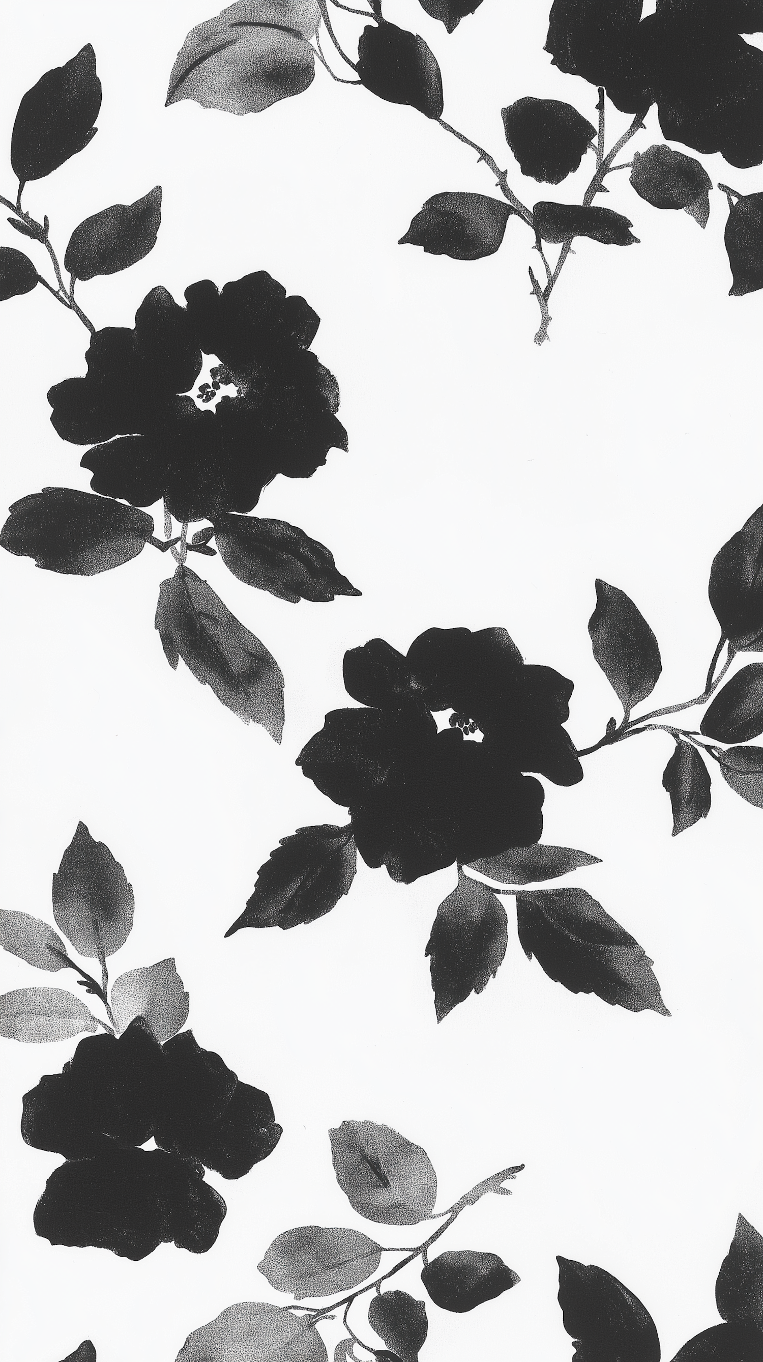 Elegant black watercolor flowers and leaves on a white background, creating a bold and artistic floral pattern.