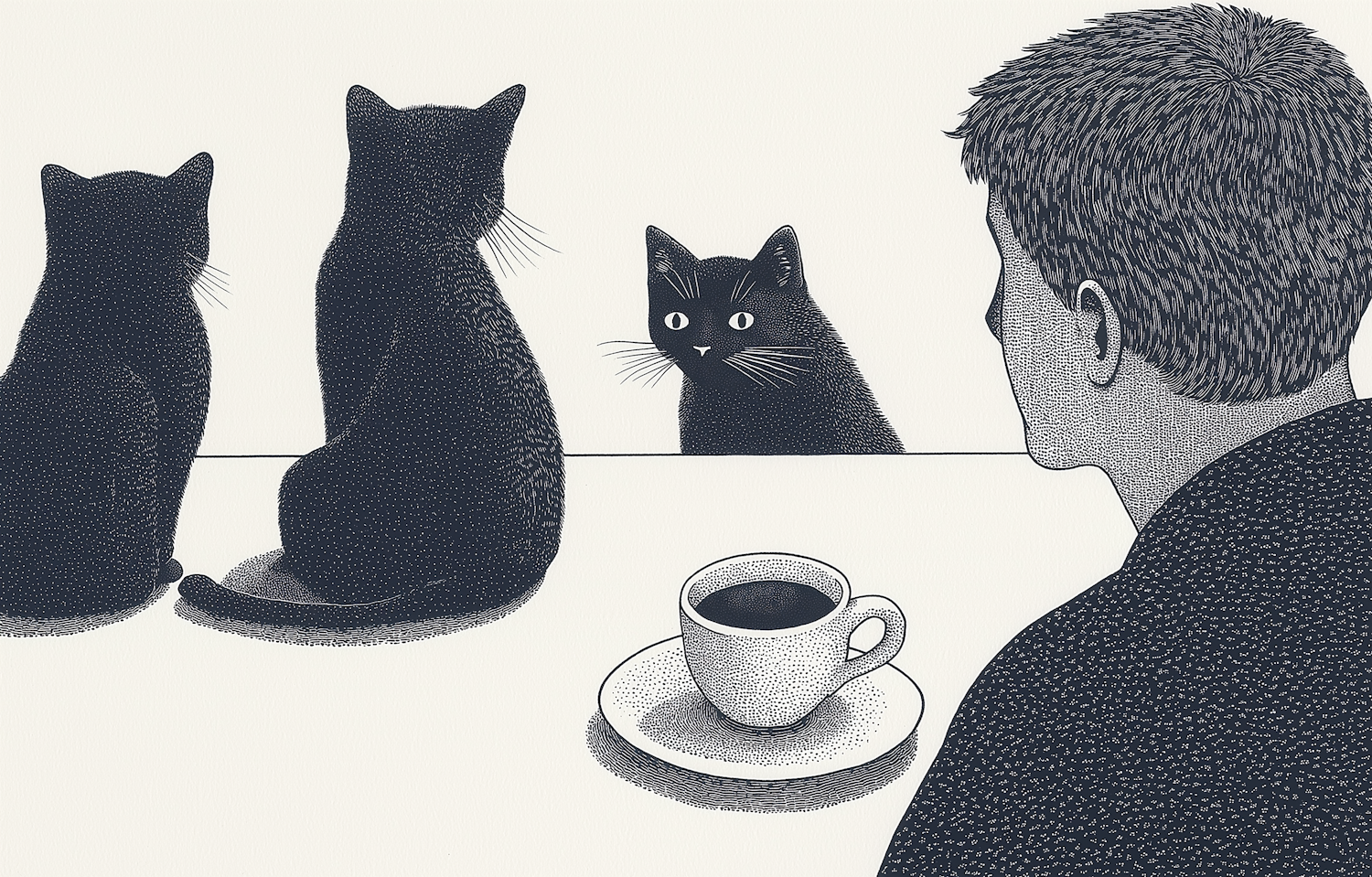 Monochrome illustration of a man and three cats at a table with coffee, using stippling for texture and a whimsical, relaxed vibe.