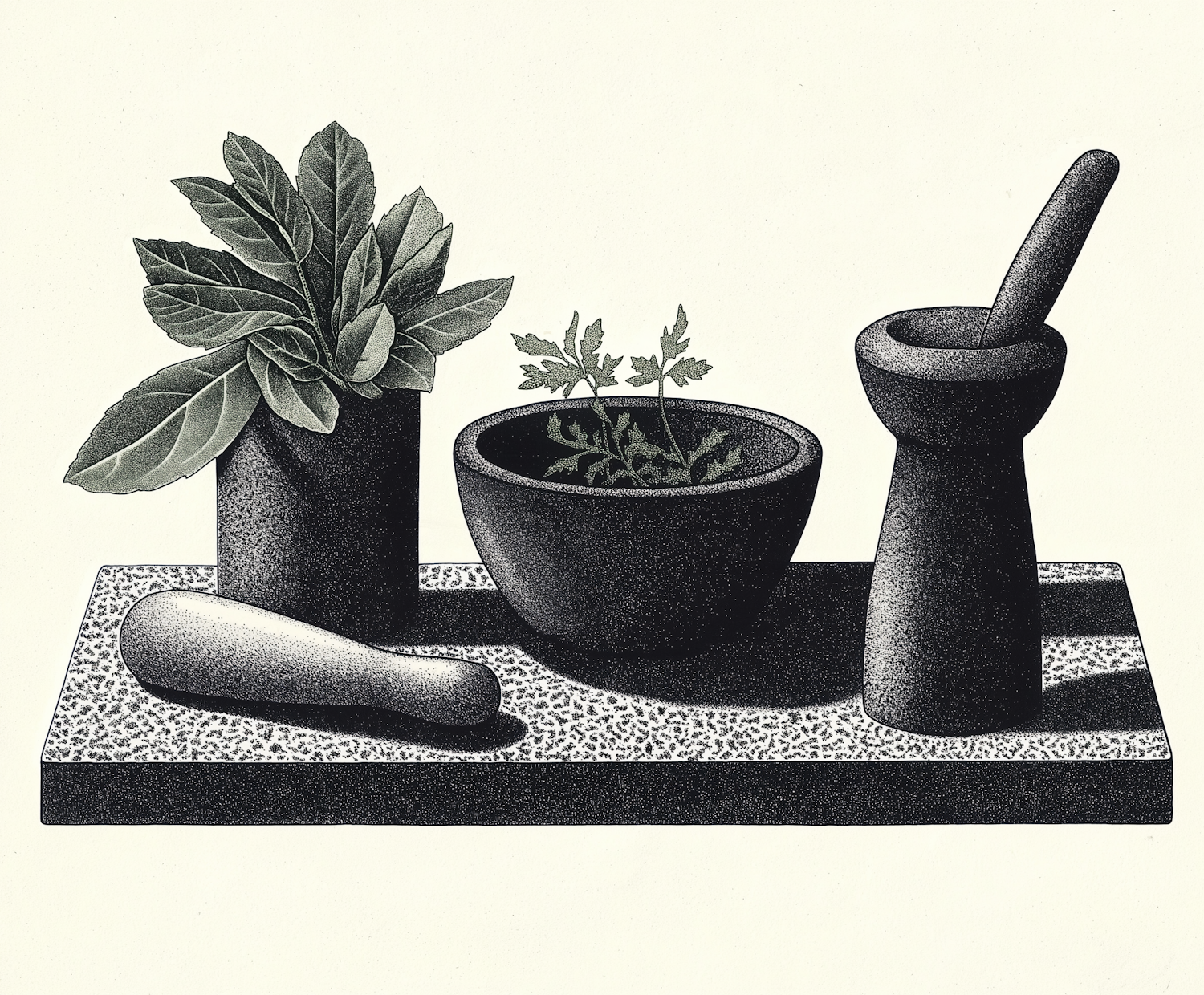Monochrome illustration of a mortar and pestle with herbs, using stippling technique for texture and detail.