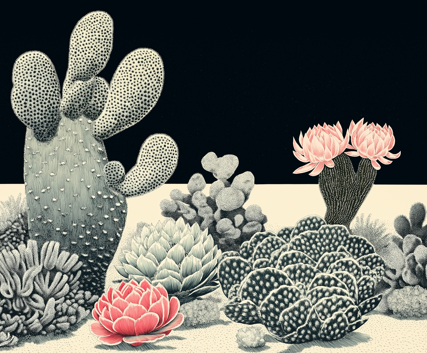 Intricate illustration of diverse cacti and succulents with pink blooms against a black background, showcasing desert flora beauty.