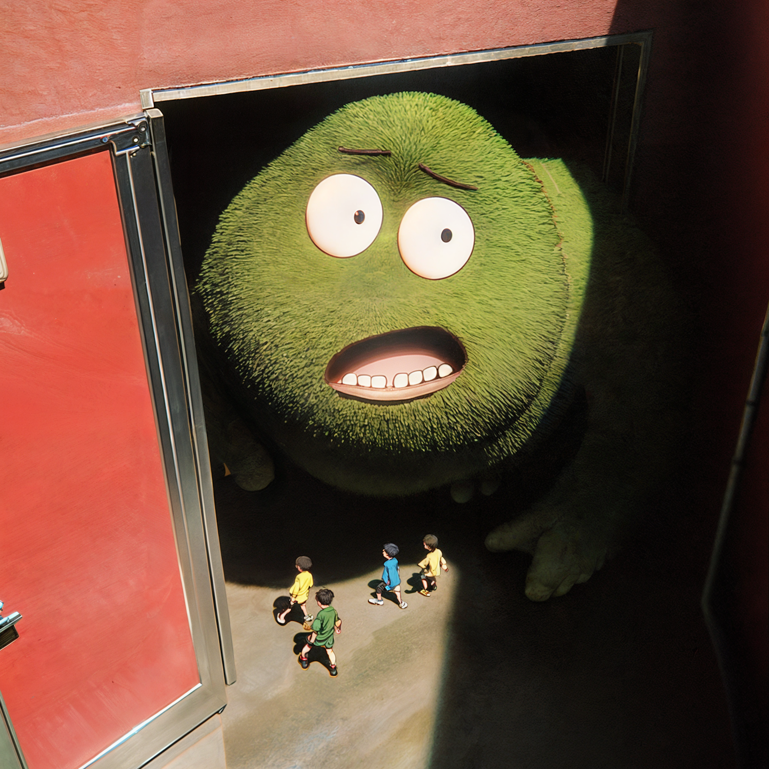 A giant green fuzzy monster peeks out of a doorway as four kids in colorful outfits approach, creating a whimsical and curious scene.