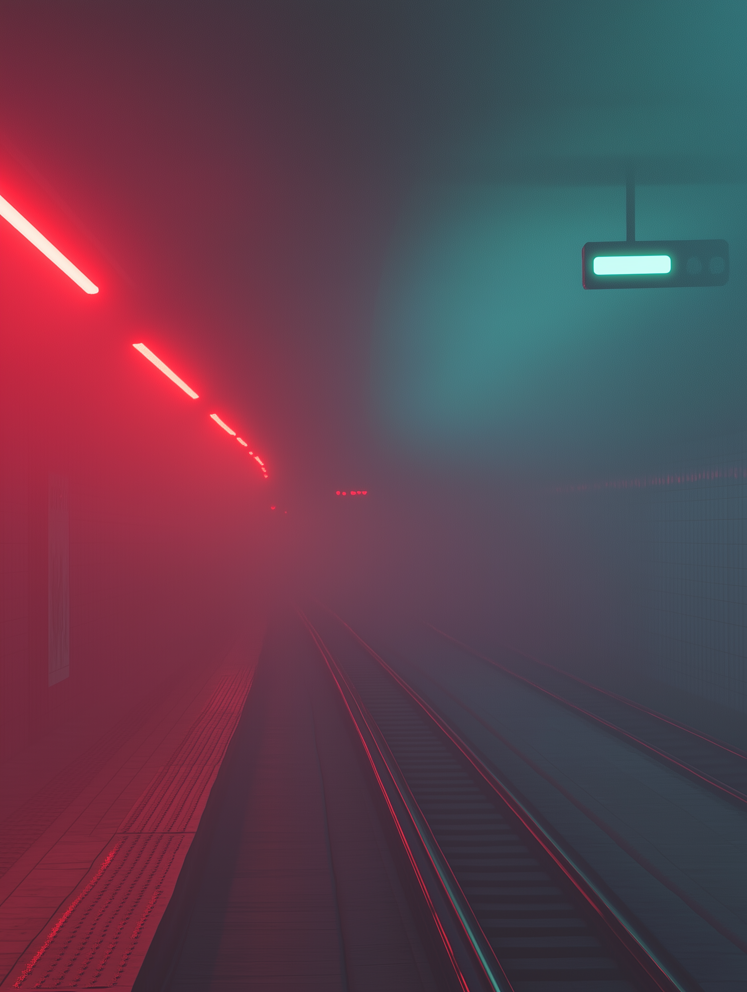 Moody subway tunnel with red and teal lighting, creating a mysterious and atmospheric scene with fog and disappearing tracks.