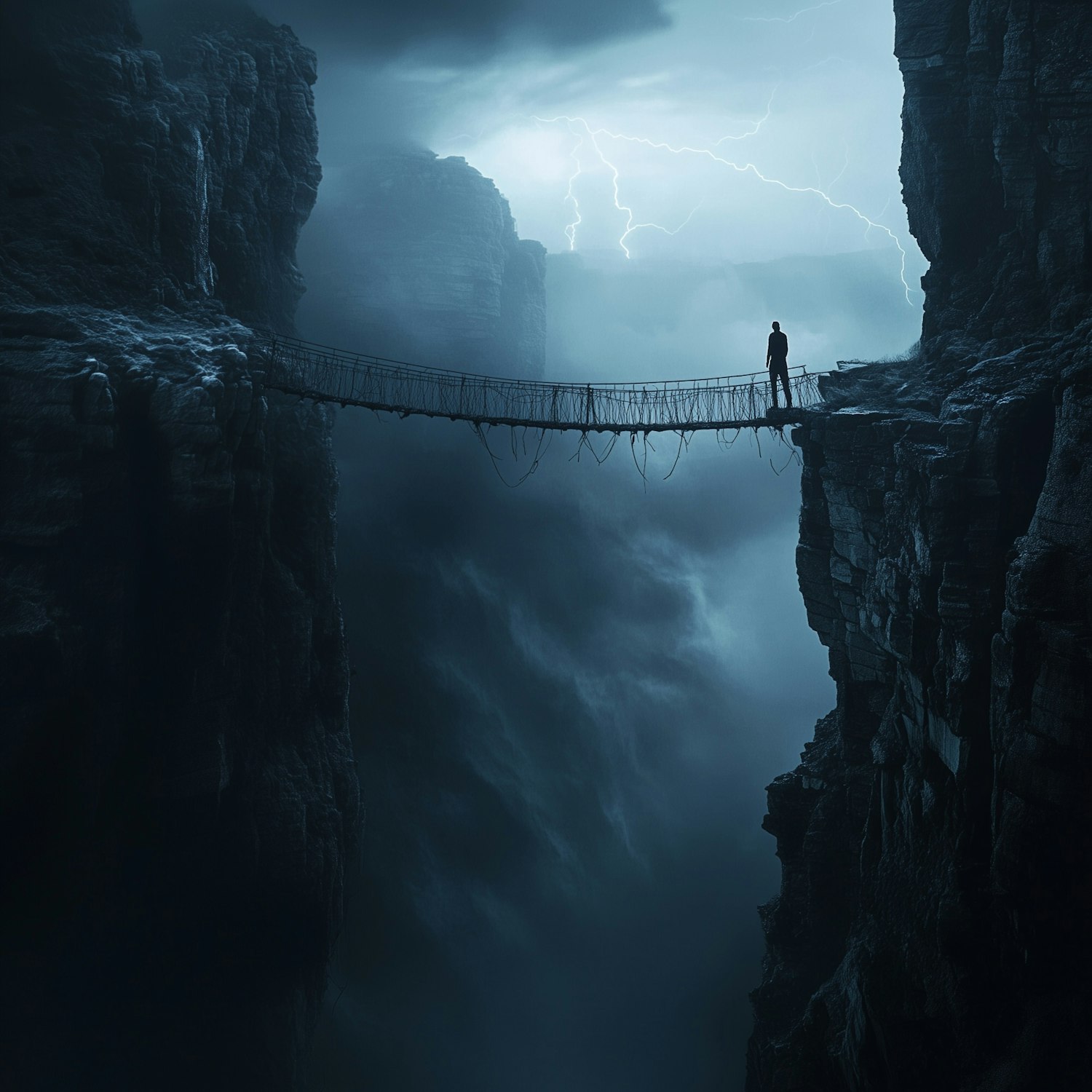 A lone figure stands on a fragile suspension bridge over a foggy canyon, with lightning illuminating the stormy sky. A dramatic, eerie scene.