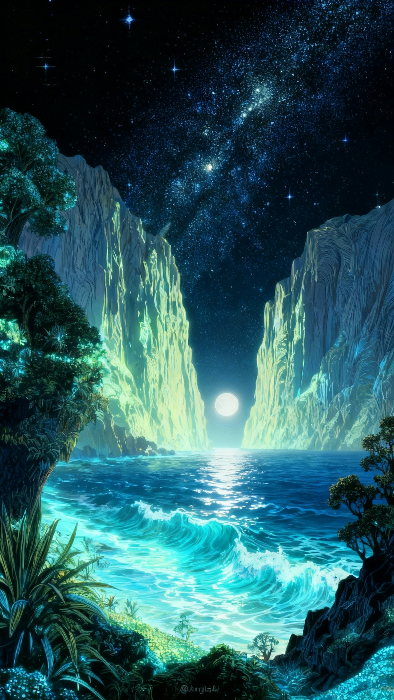A stunning night scene with a glowing moon, bioluminescent waves, and a starry sky framed by cliffs and lush vegetation.
