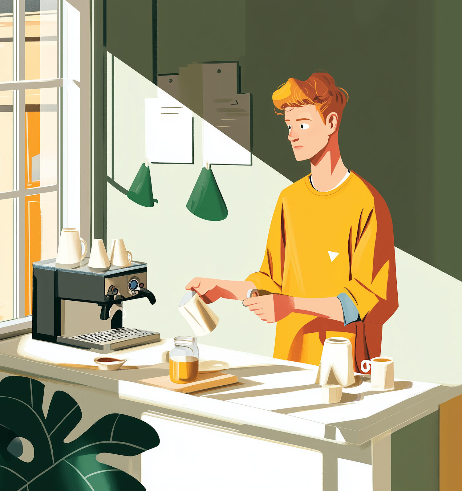 Stylized illustration of a young man making coffee in a sunlit kitchen with an espresso machine and modern decor.