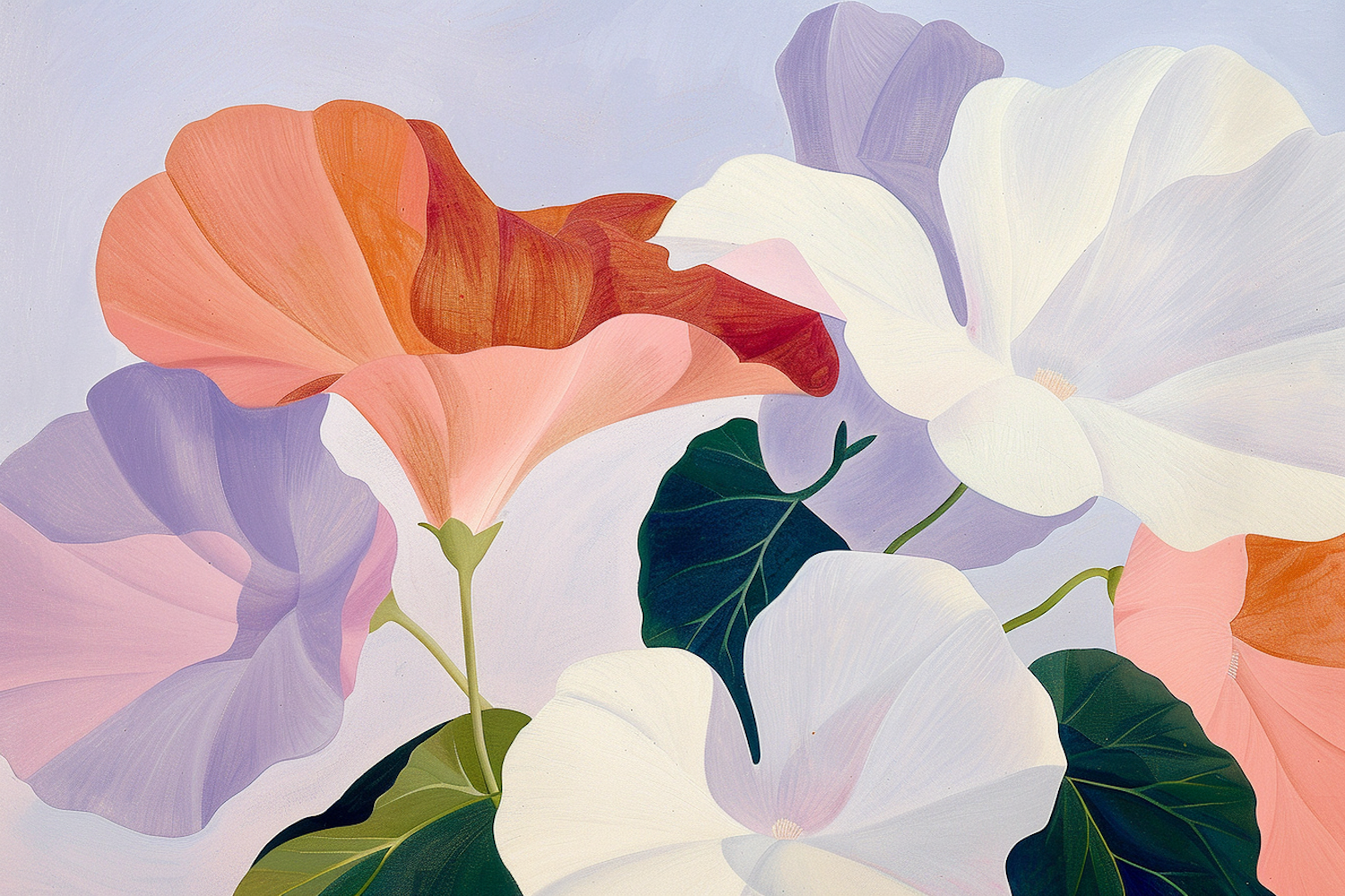 Beautifully illustrated morning glory flowers in soft tones of white, purple, and orange, detailed with green leaves against a pastel backdrop.