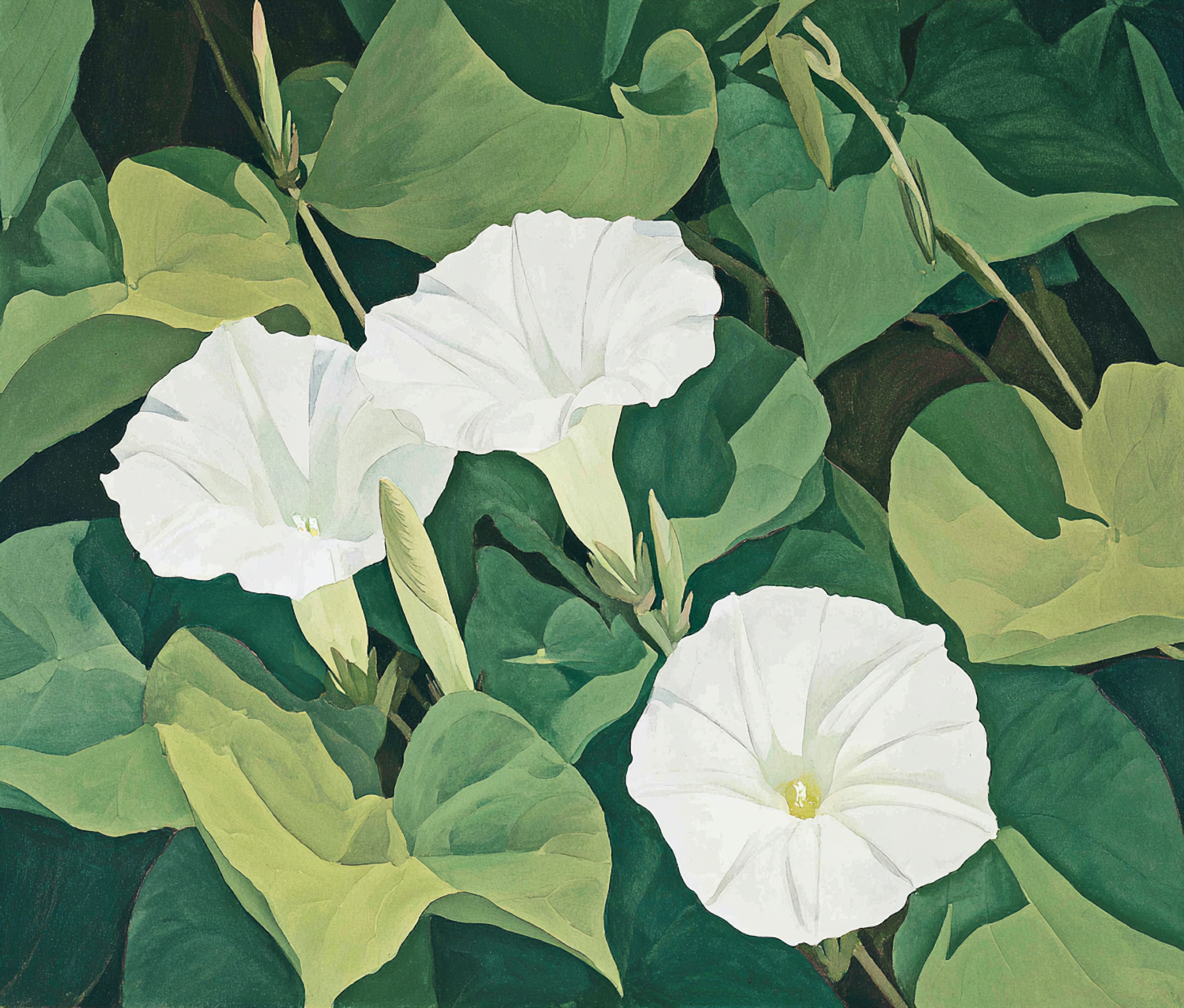 A serene artwork depicting white morning glory flowers surrounded by lush green leaves, merging nature's elegance and artistic grace.