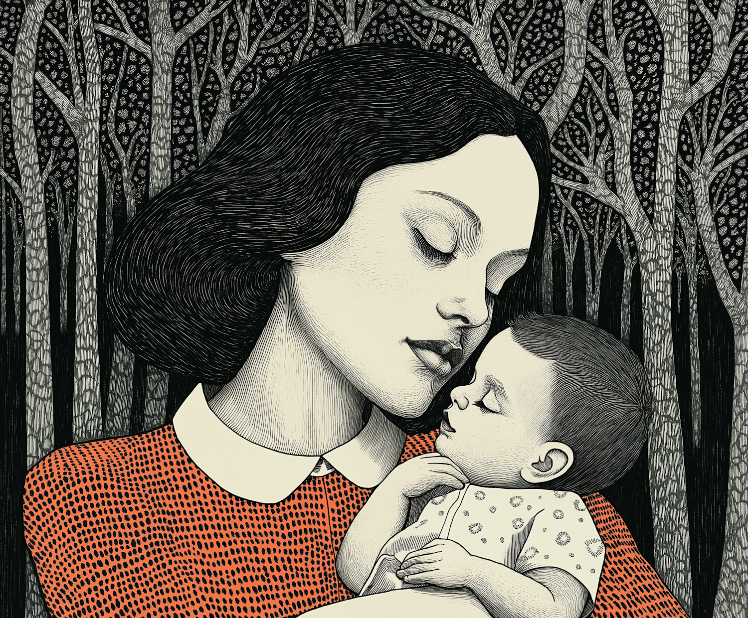 Illustration of a mother lovingly cradling her baby in a serene forest setting, highlighting warmth and tenderness.