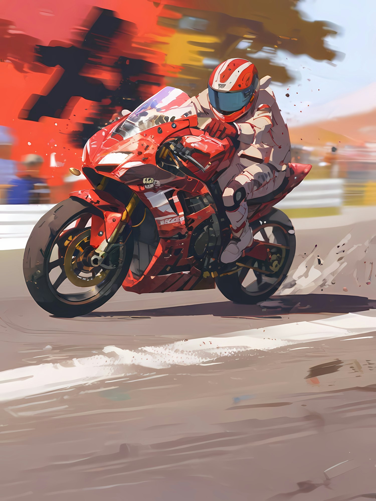 High-speed motorcycle racing illustration with a red sports bike, vibrant motion blur, and a rider in a matching red and white suit.