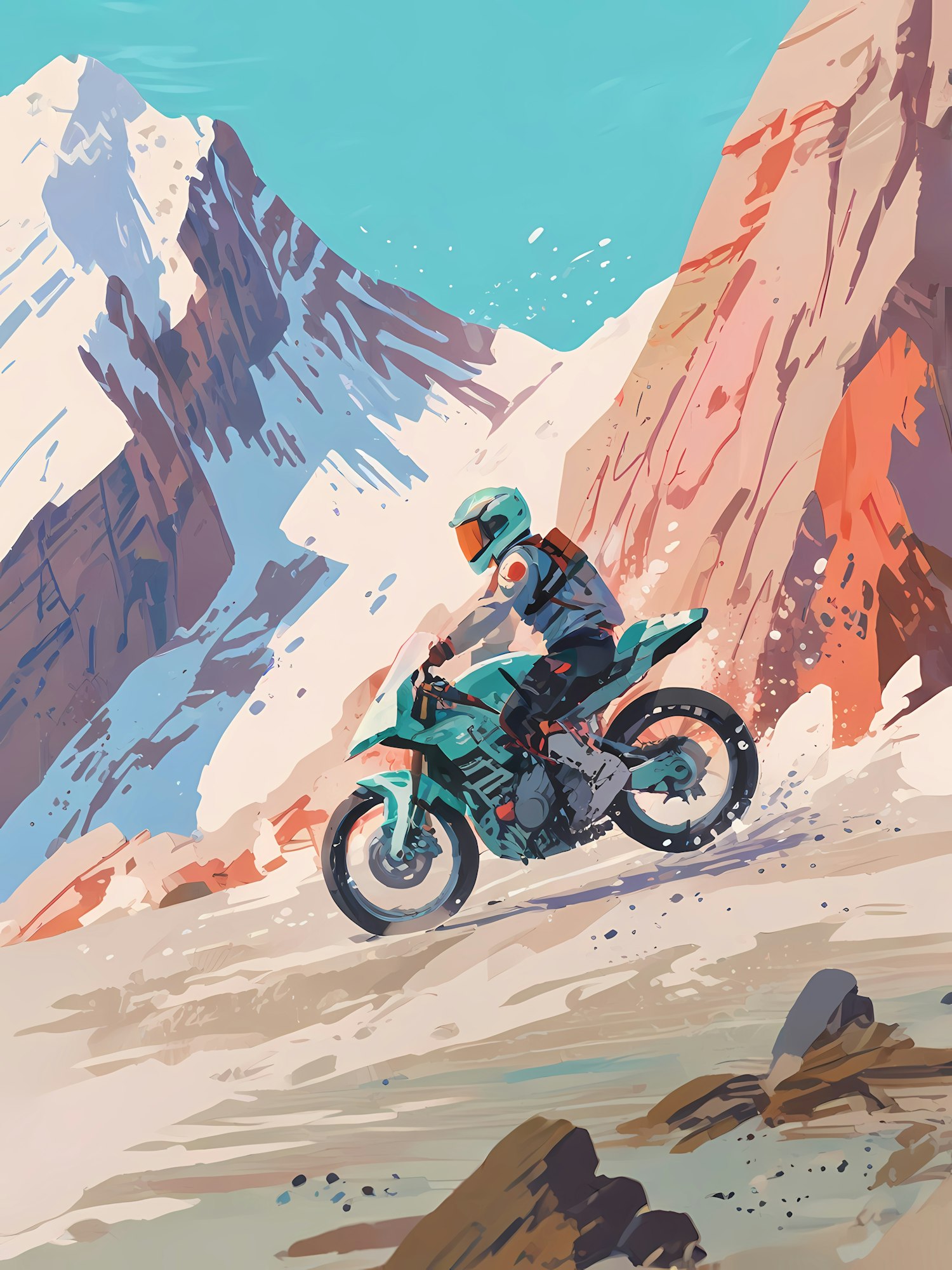 Illustration of a motorcyclist on a teal dirt bike climbing a sandy slope with snow-capped mountains in the background.