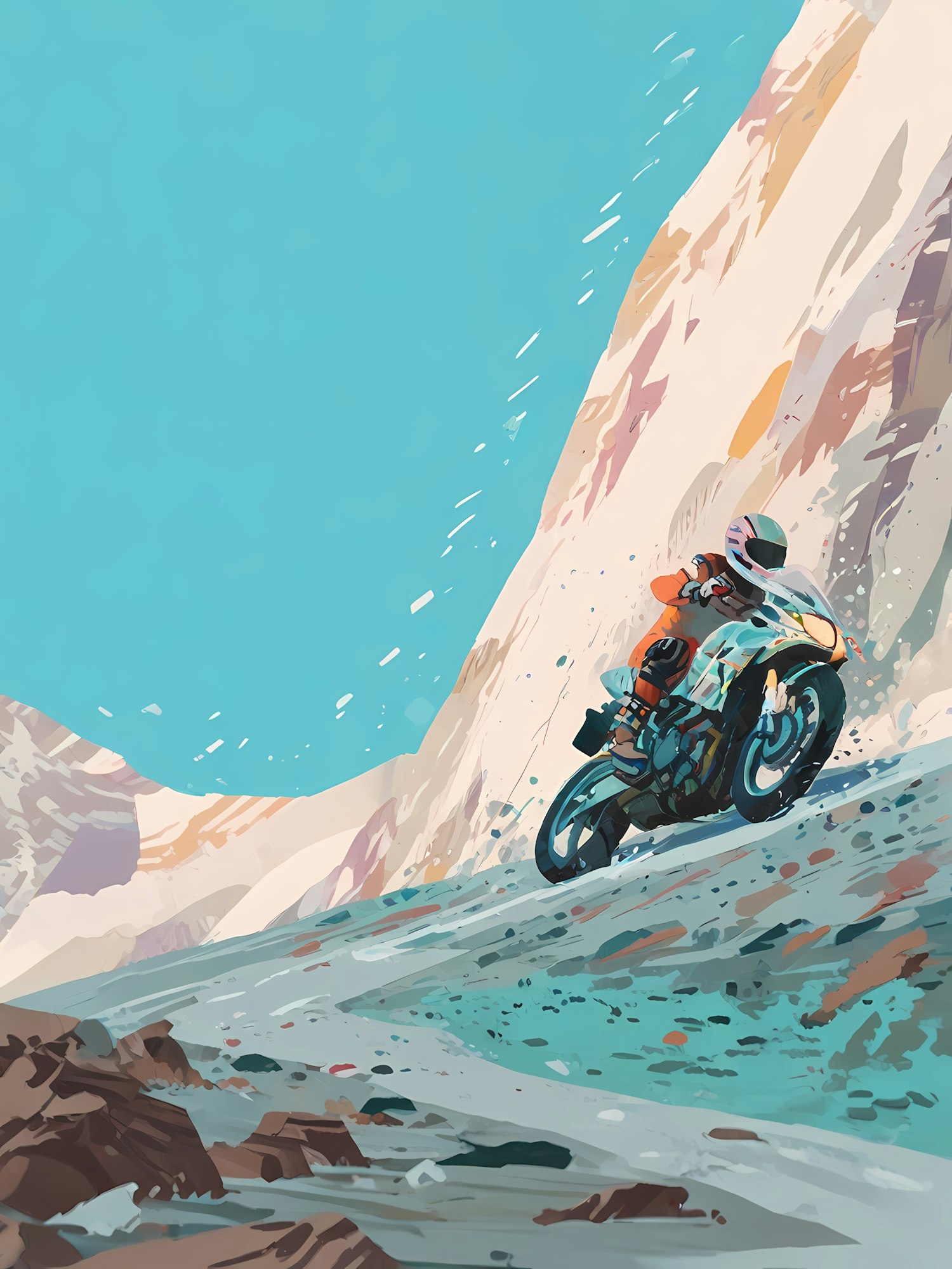 Vivid illustration of a motorcyclist tackling a steep, rocky mountain slope under a bright turquoise sky. Adventure vibes!
