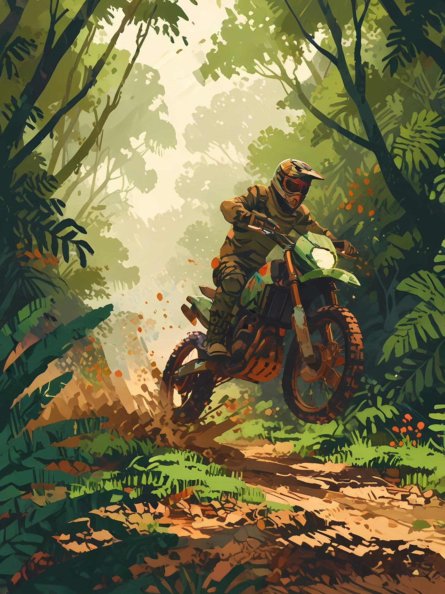 Illustration of a motorcyclist speeding through a lush jungle trail, kicking up dirt and leaves, surrounded by vibrant greenery.