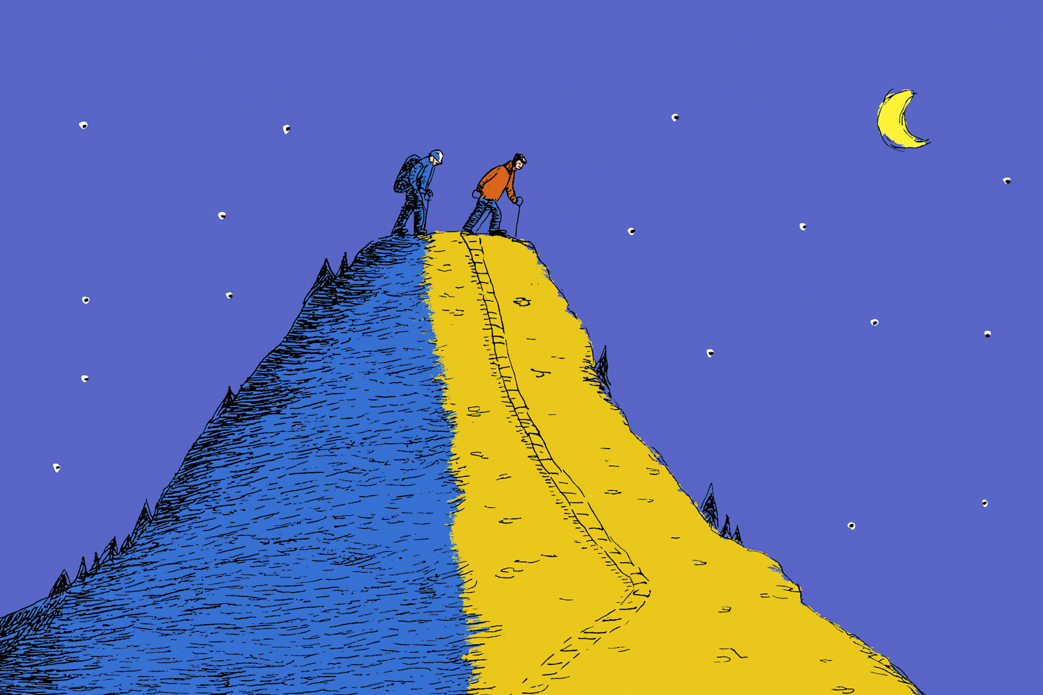 Illustration of two hikers climbing a mountain split into blue and yellow under a starry night sky, symbolizing unity and perseverance.