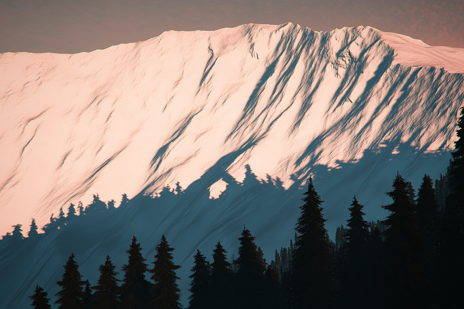 Snowy mountain with dramatic shadows from evergreen trees, bathed in warm light. A serene and majestic natural landscape.