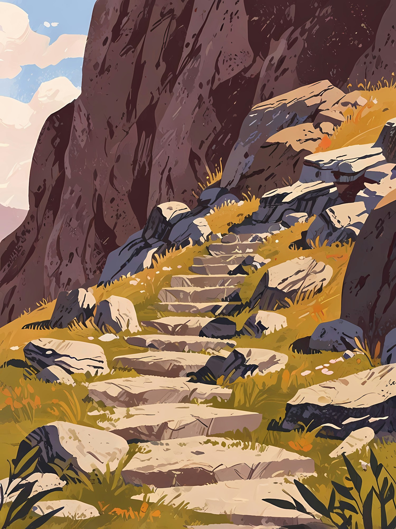 A beautiful illustration of a stone path winding up a rocky mountainside, surrounded by grass and set against a bright, partly cloudy sky.