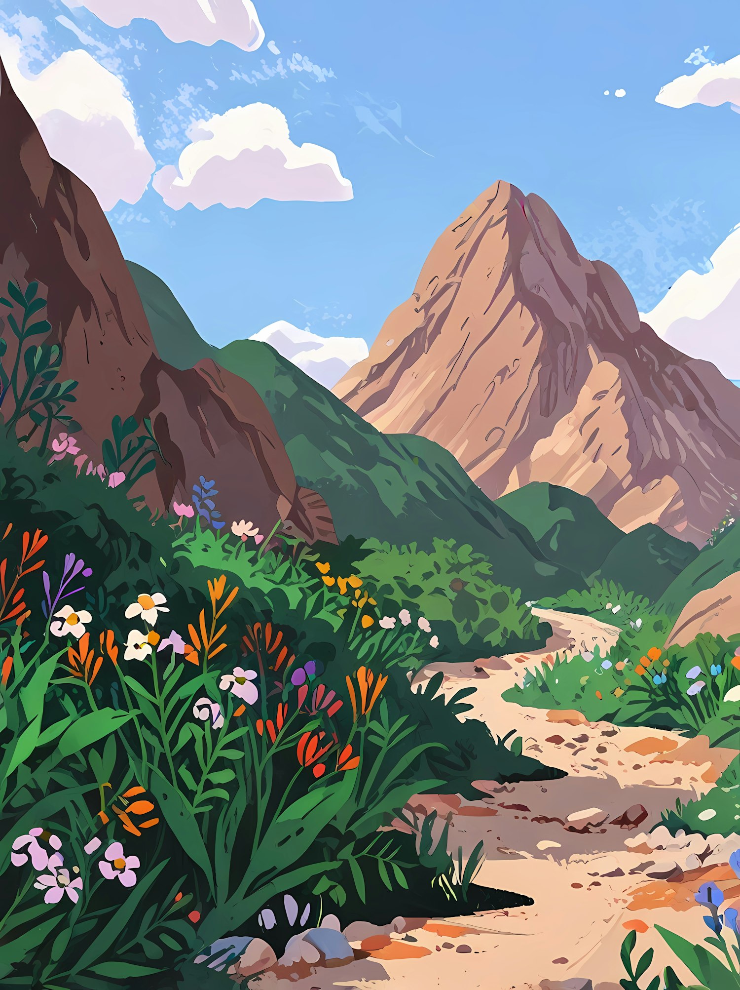 Colorful mountain landscape illustration with a dirt path, vibrant wildflowers, green hills, and a majestic rocky peak under a blue sky.