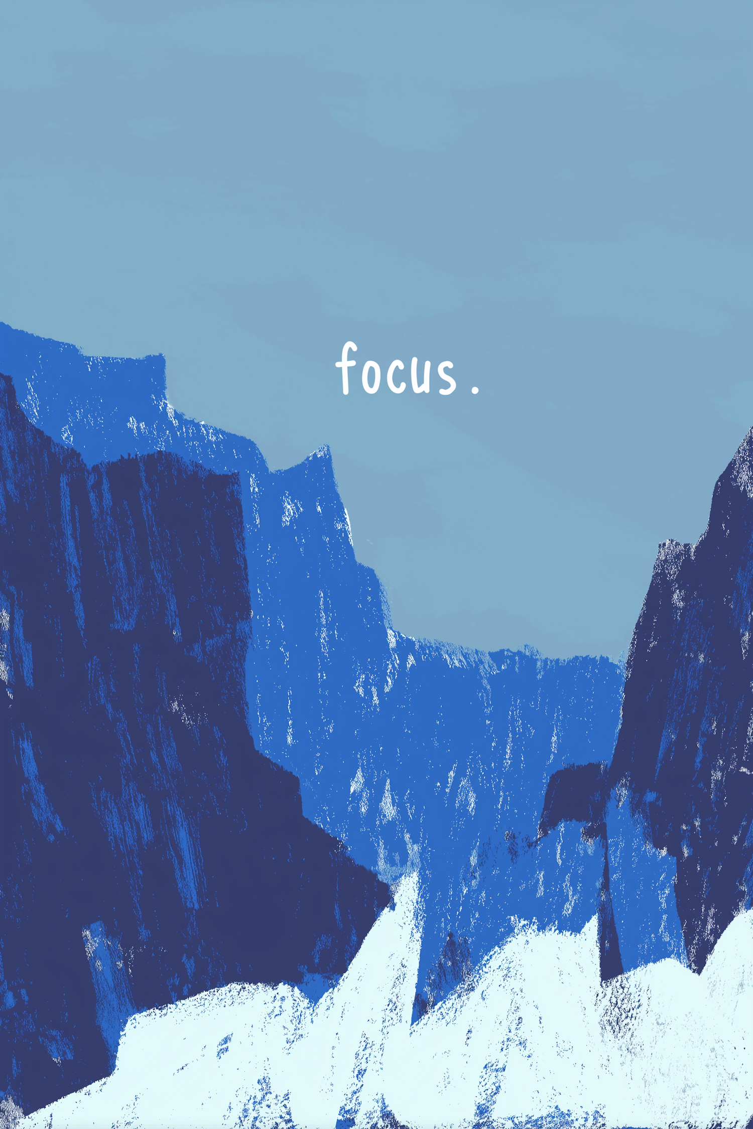 Minimalist blue mountain illustration with the word 'focus.' in white, evoking calm and concentration in a serene landscape.
