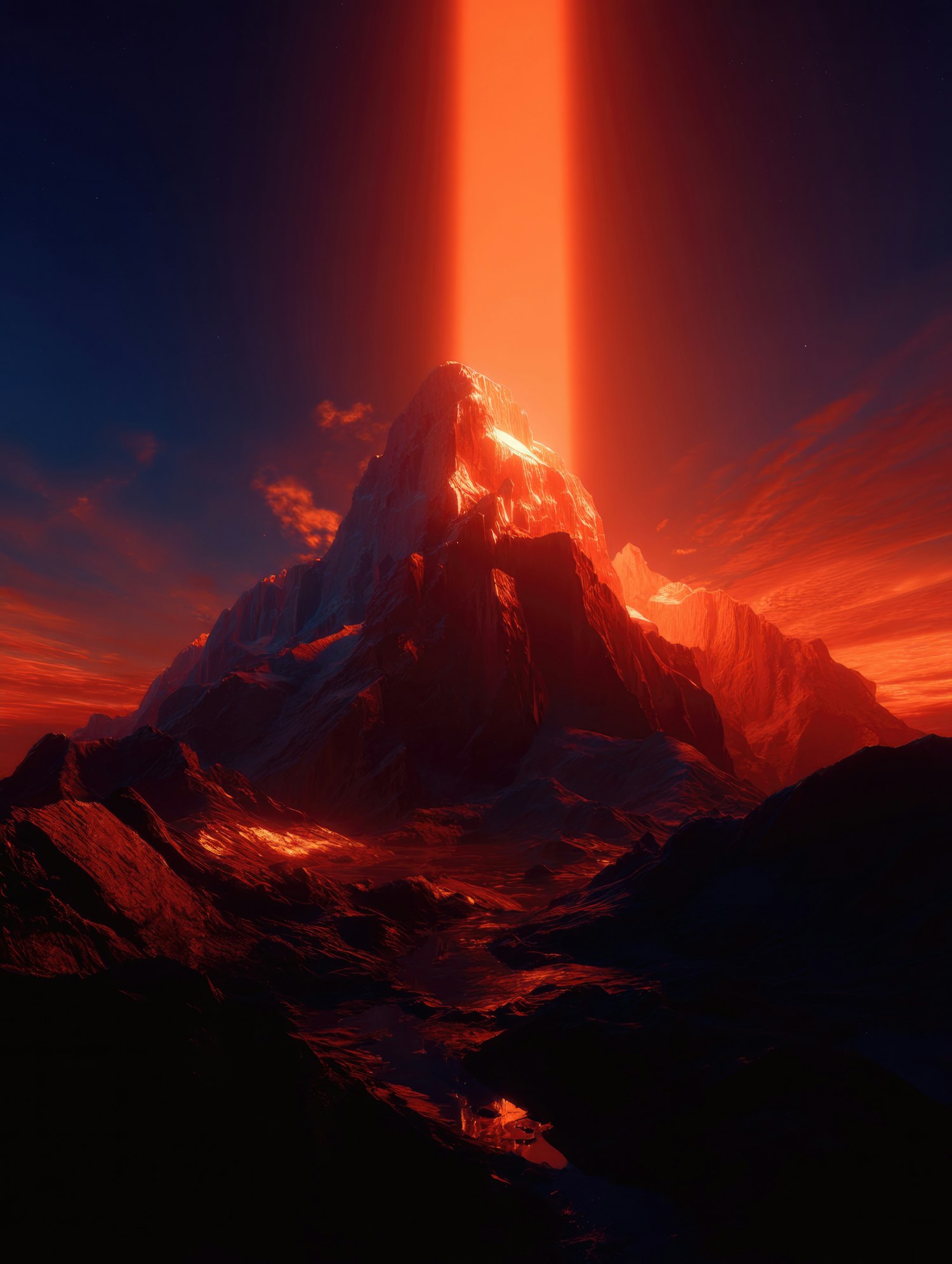 A majestic, glowing red mountain under a dark sky, enveloped in striking light beams creating a surreal, otherworldly landscape.