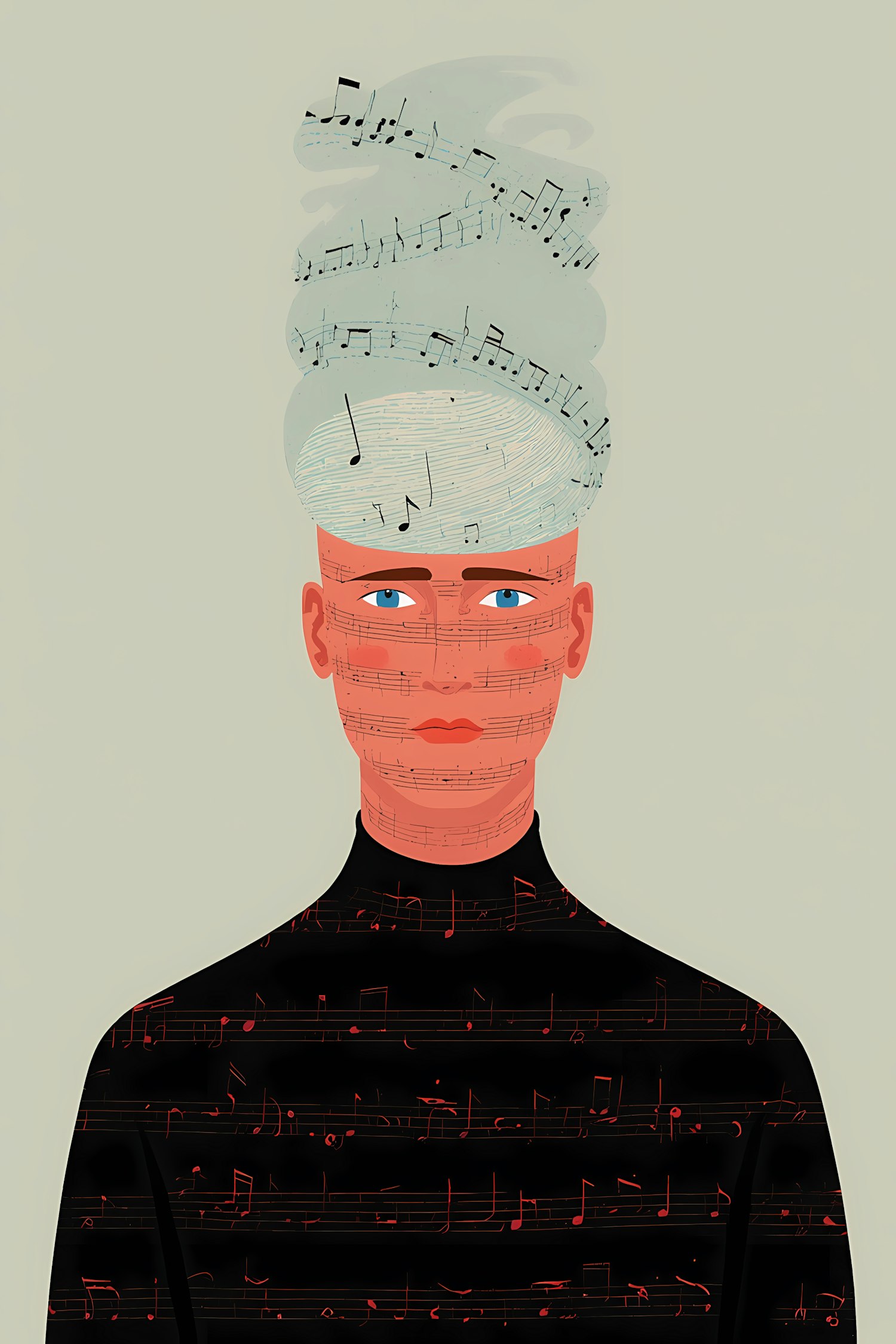 Stylized illustration of a person with musical notes swirling above their head and on their black attire, set against a beige background.