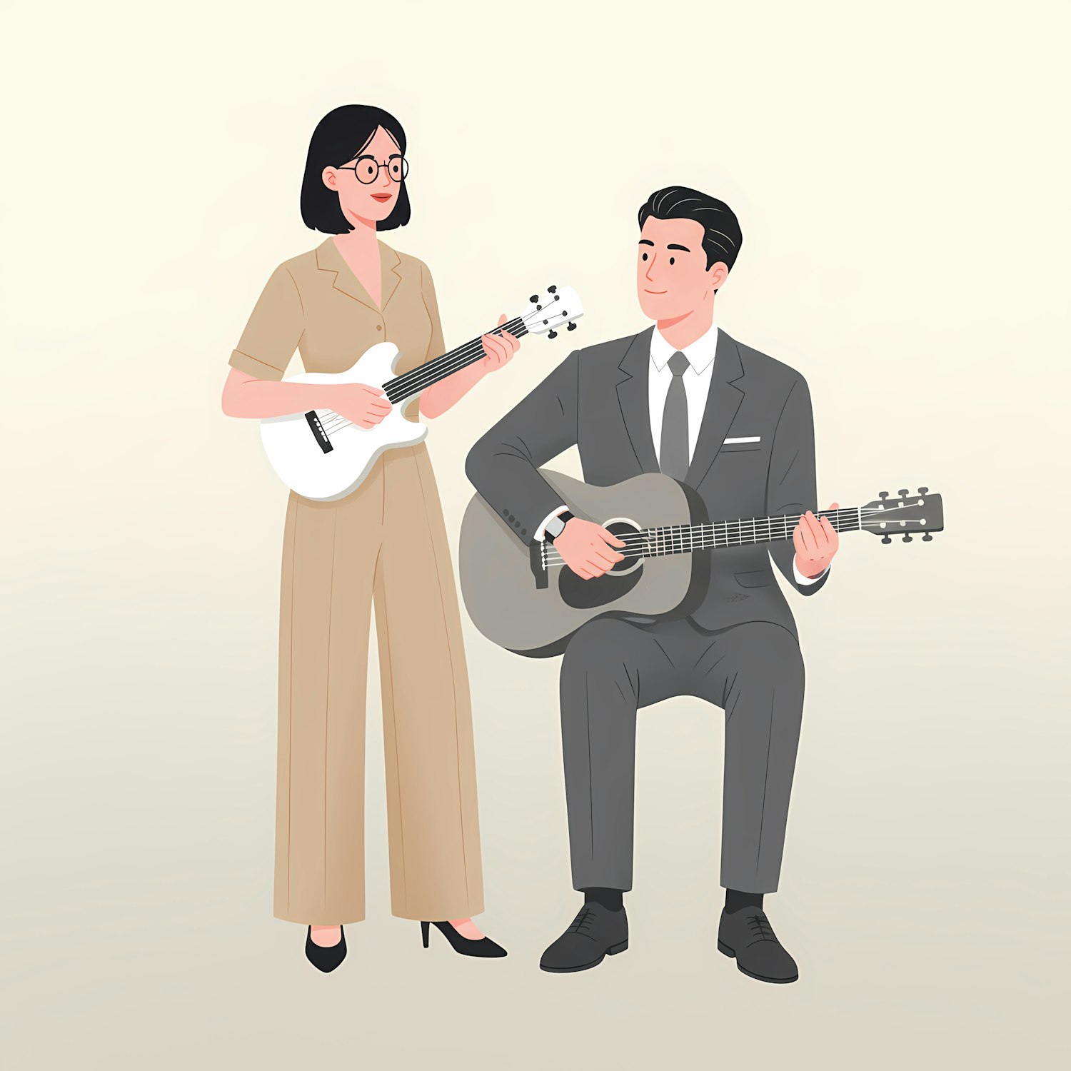 Illustration of a man and woman playing guitar and ukulele, dressed formally, against a light beige background.