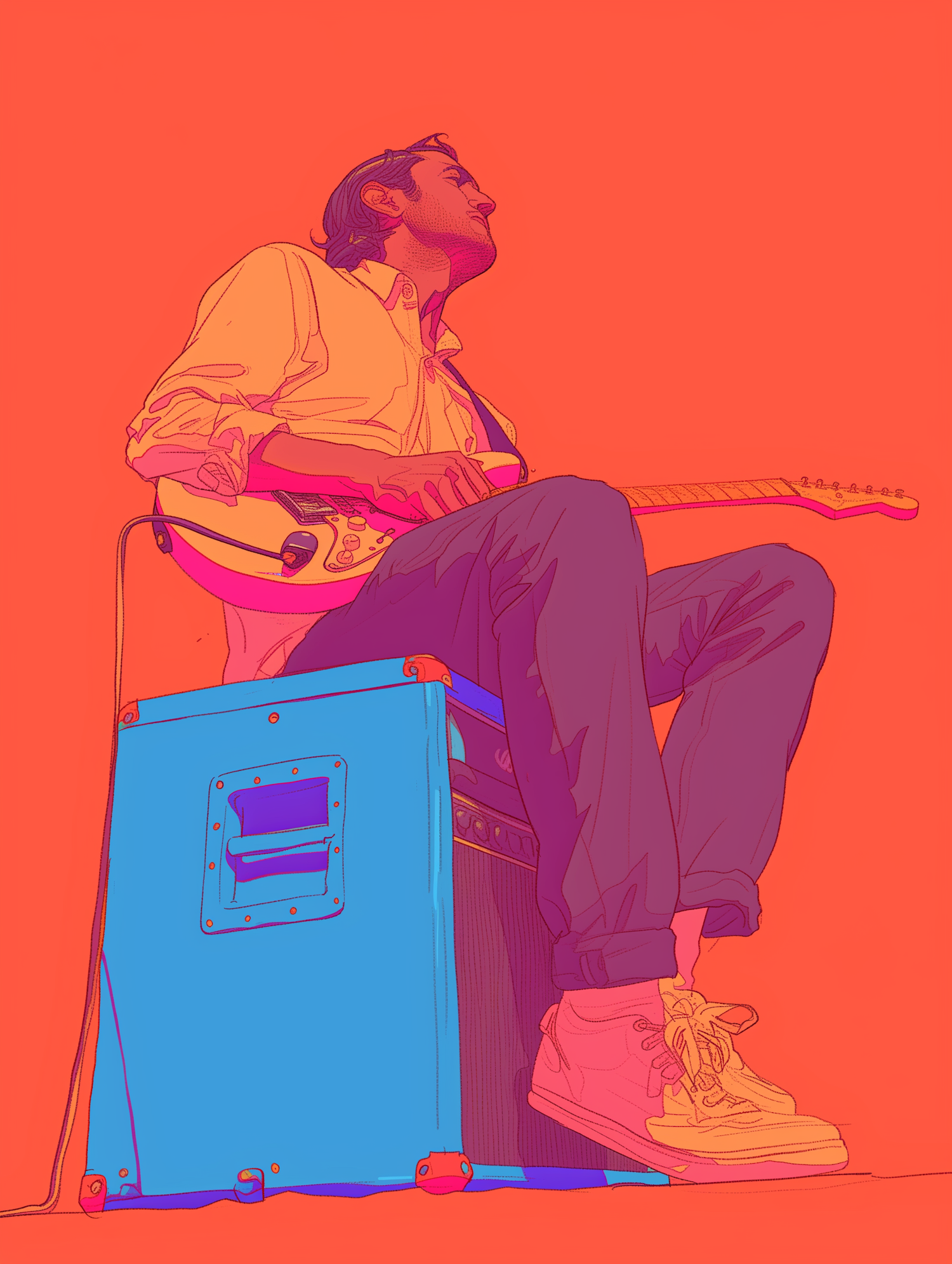 Stylized illustration of a man playing guitar on a blue amp against a vibrant orange background. Bold colors and modern artistic style.