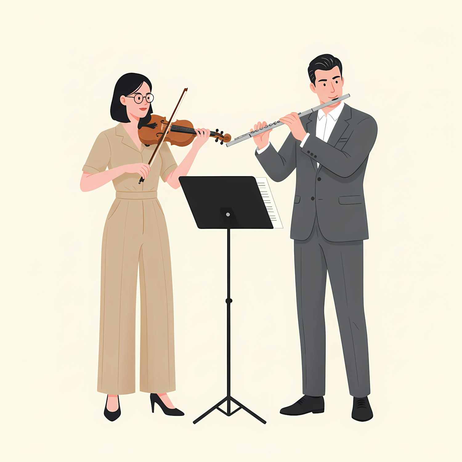 Illustration of a violinist and flutist performing together, dressed formally, with a music stand between them.