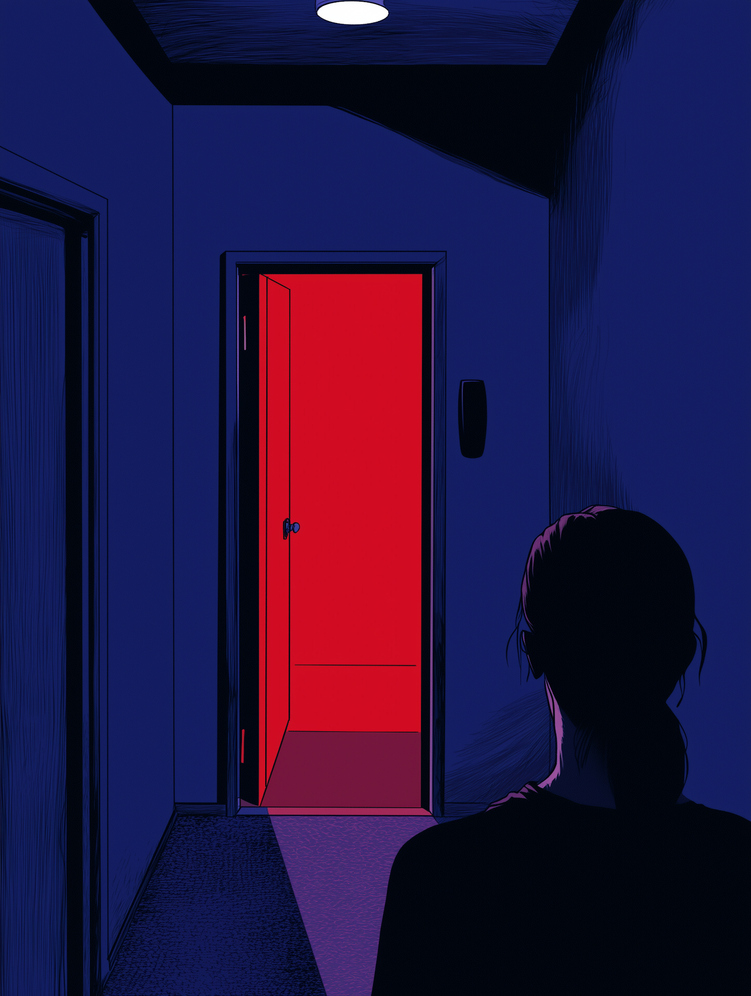 A mysterious hallway with a silhouette facing a bright red-lit room, creating a suspenseful and intriguing atmosphere.